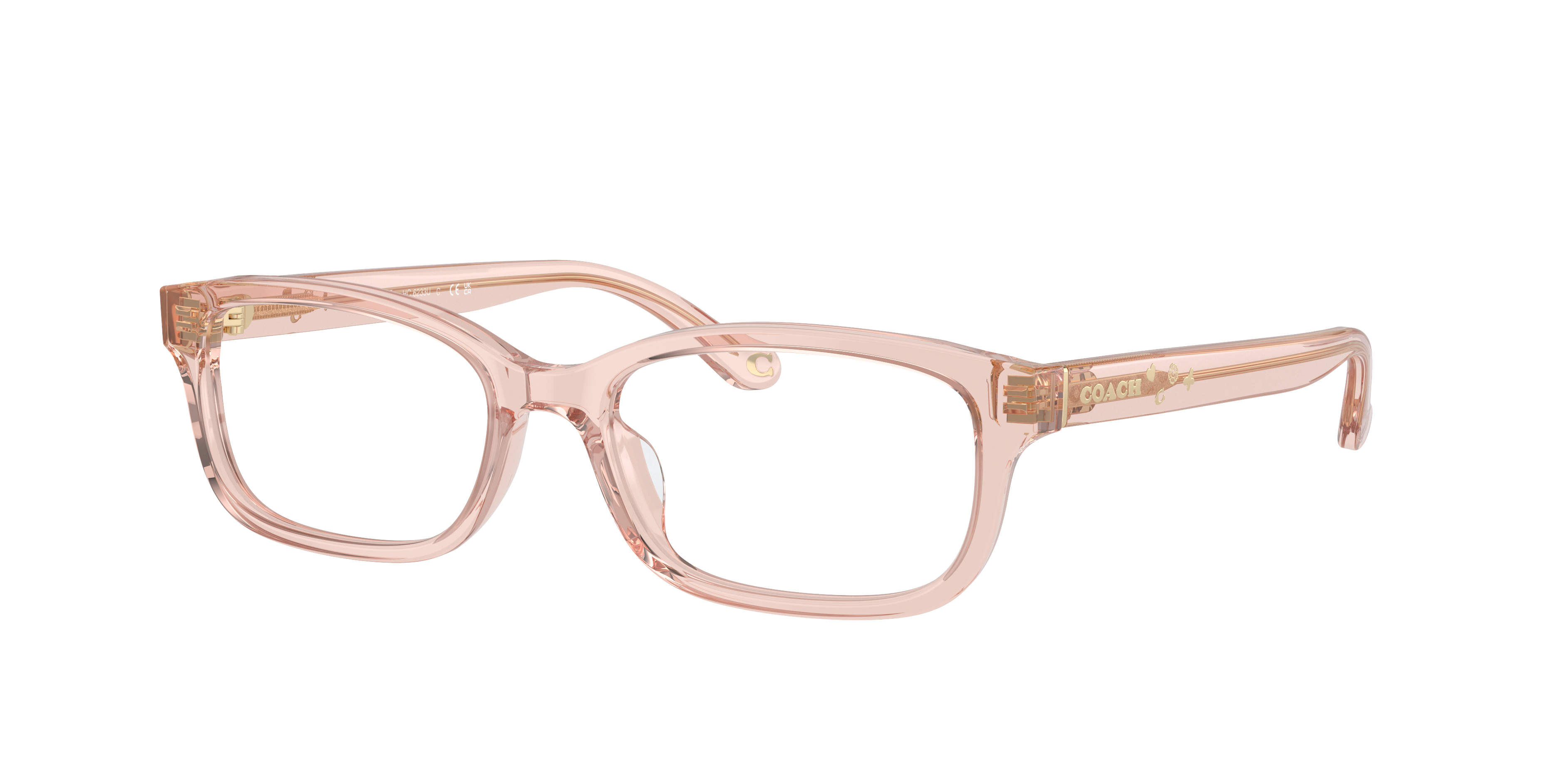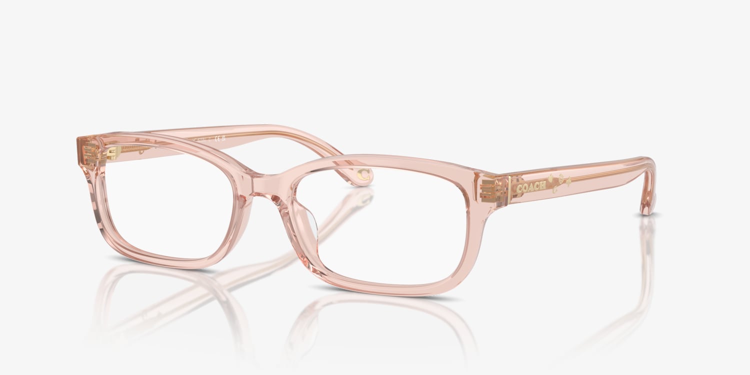 Elevate your fashion while optimizing utility with Coach HC6233U optical glasses. The rectangle shape and transparent dusty rose frame color, made from durable acetate, strike a perfect balance between style and comfort. The shiny finish adds a touch of sophistication to these frames. With their versatile design, these glasses can be worn as an everyday accessory or during special occasions. Available with prescription lenses.
