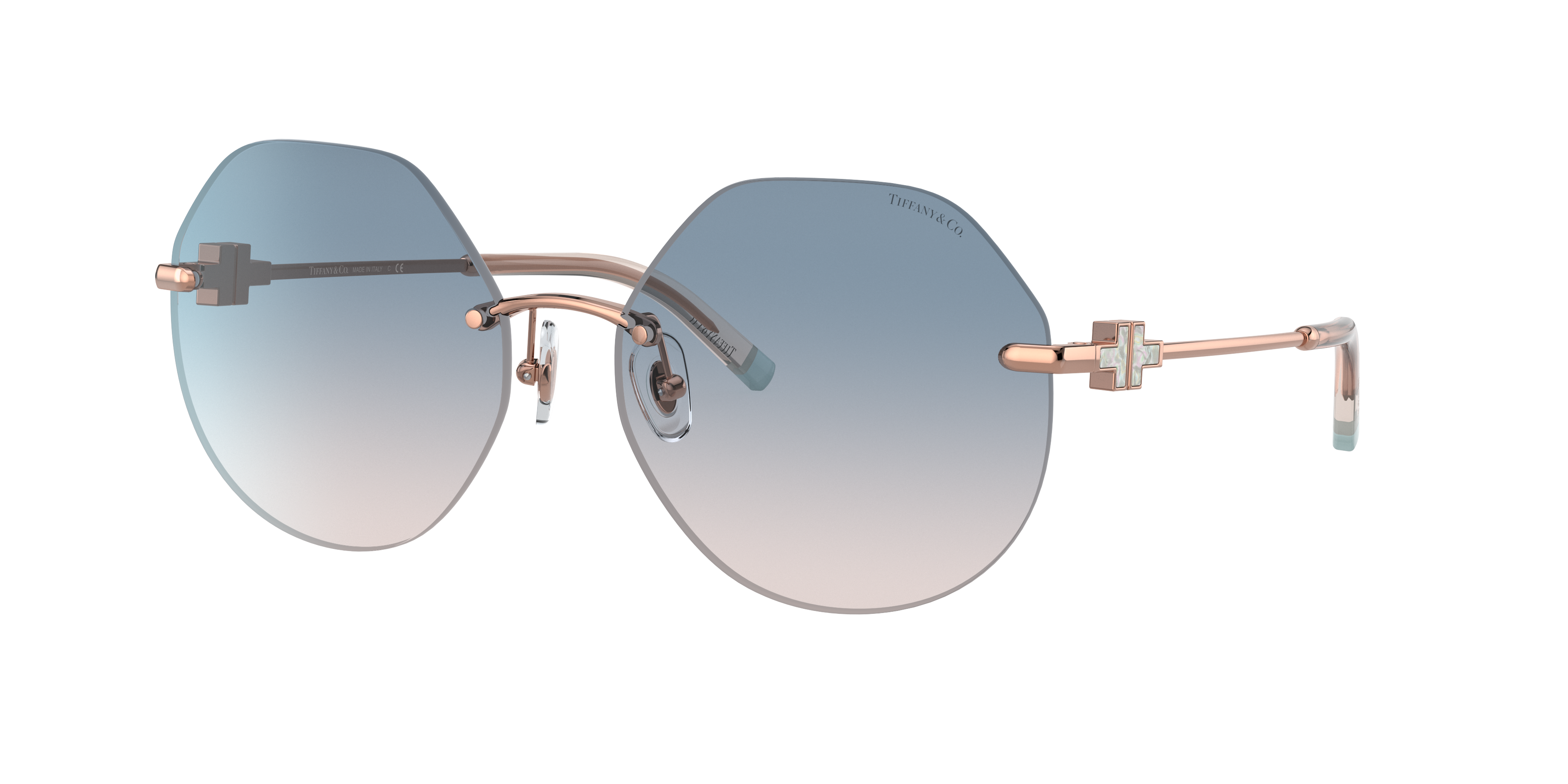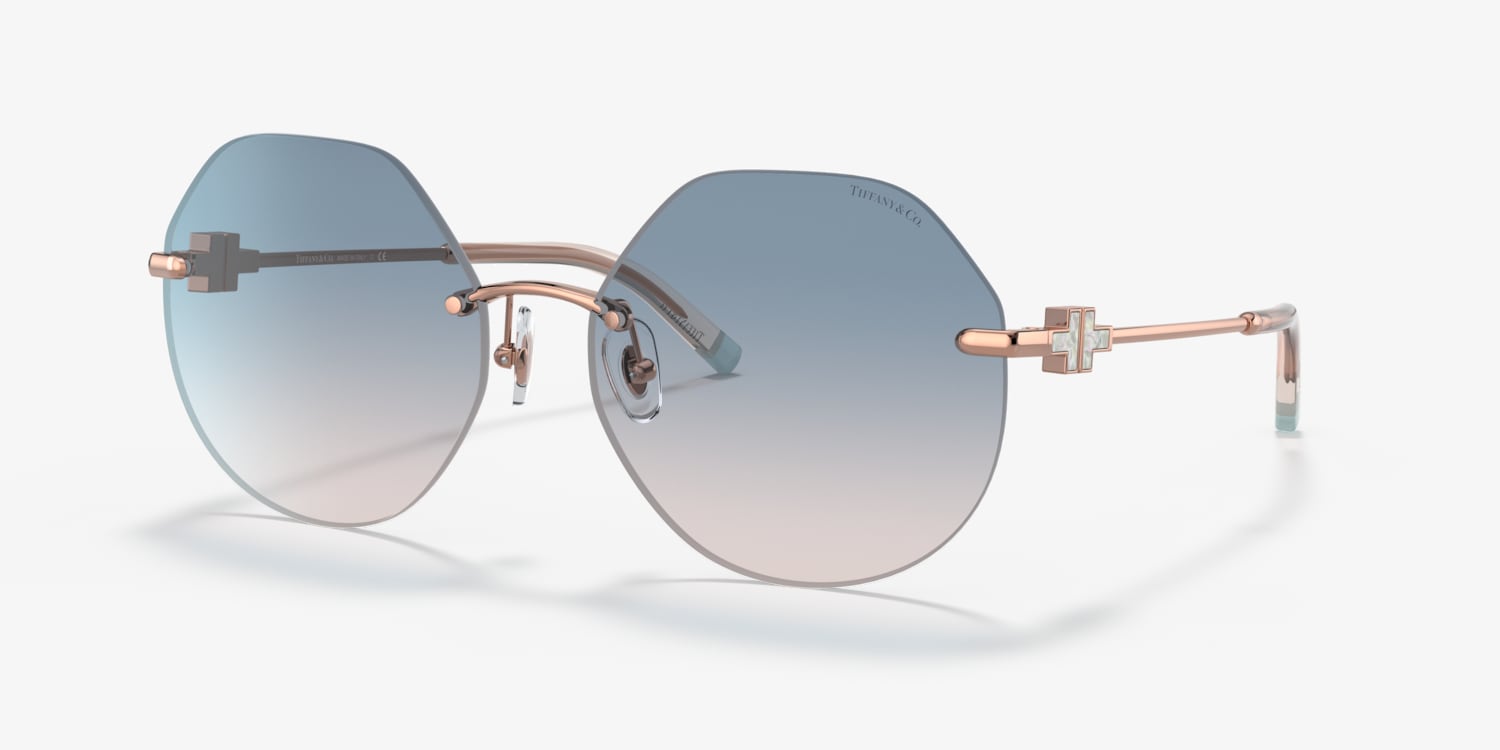 Experience the allure of Tiffany & Co.'s TF3077 sunglasses, designed with a unique irregular shape that adds a touch of sophistication to any look. Crafted from durable metal in a polished rubedo finish, these glasses feature gradient lenses in a striking blue color. The irregular shape provide a modern twist on the timeless style of Tiffany & Co. Available with prescription lenses.
