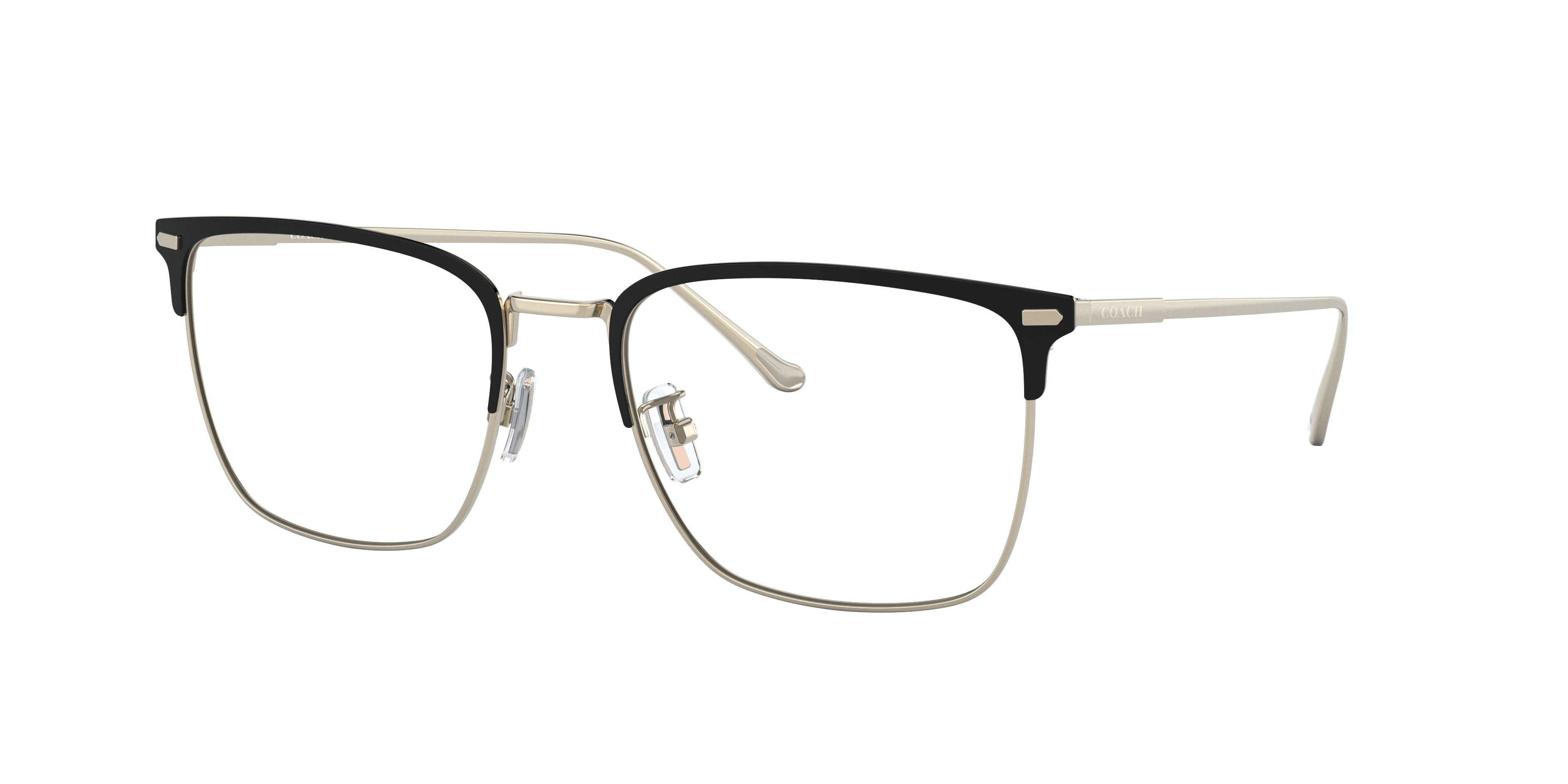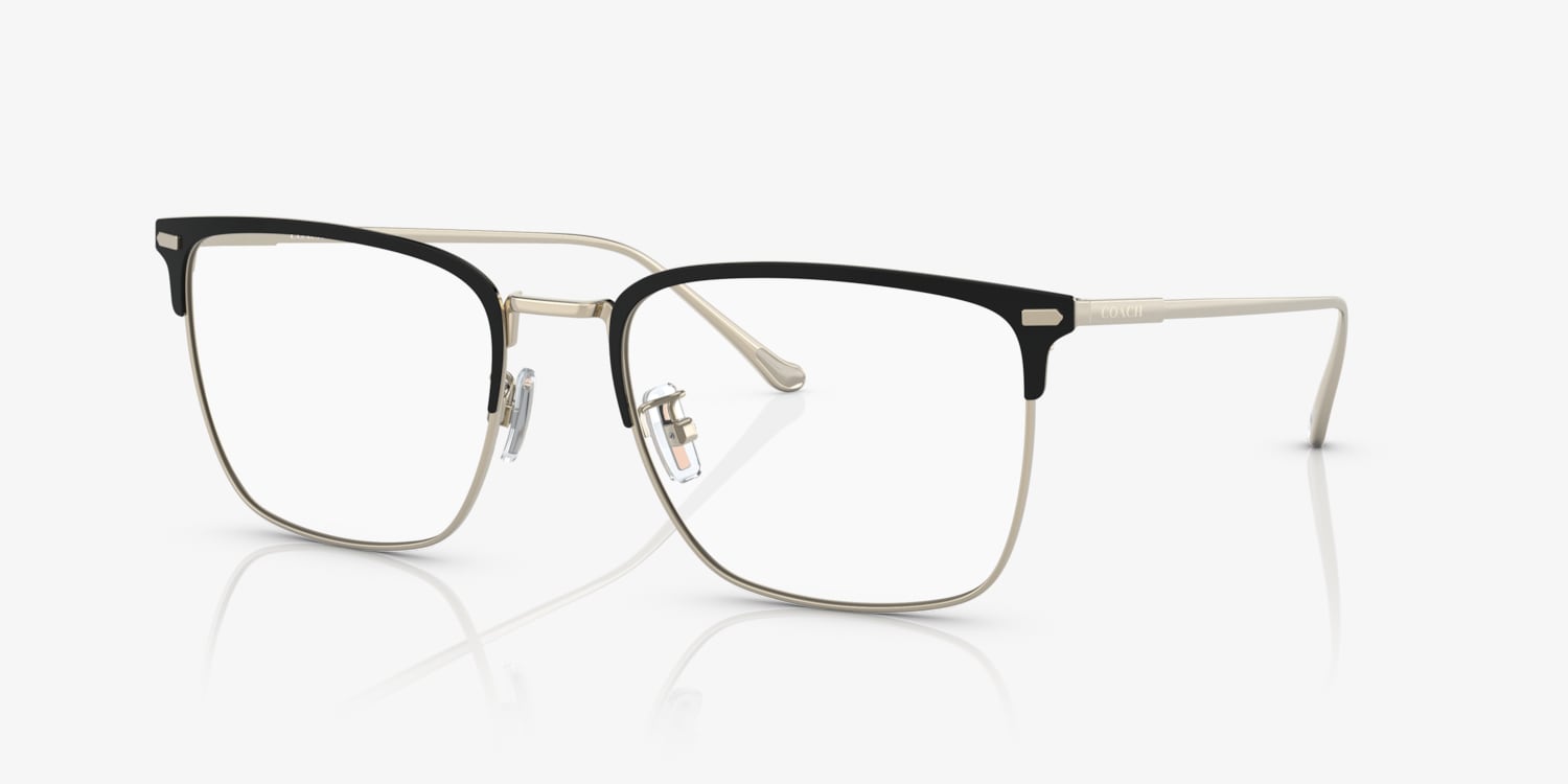 Experience the epitome of luxury and performance integration with these Coach HC5149T eyeglasses. Crafted from titanium, these square-shaped frames are lightweight and durable. The polished black/light gold finish adds a touch of sophistication to any look. These glasses are designed for those who appreciate both style and comfort. Available with prescription lenses.