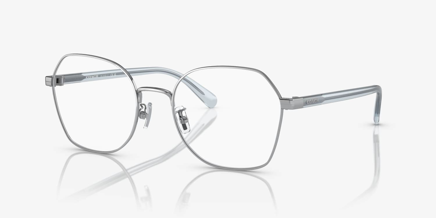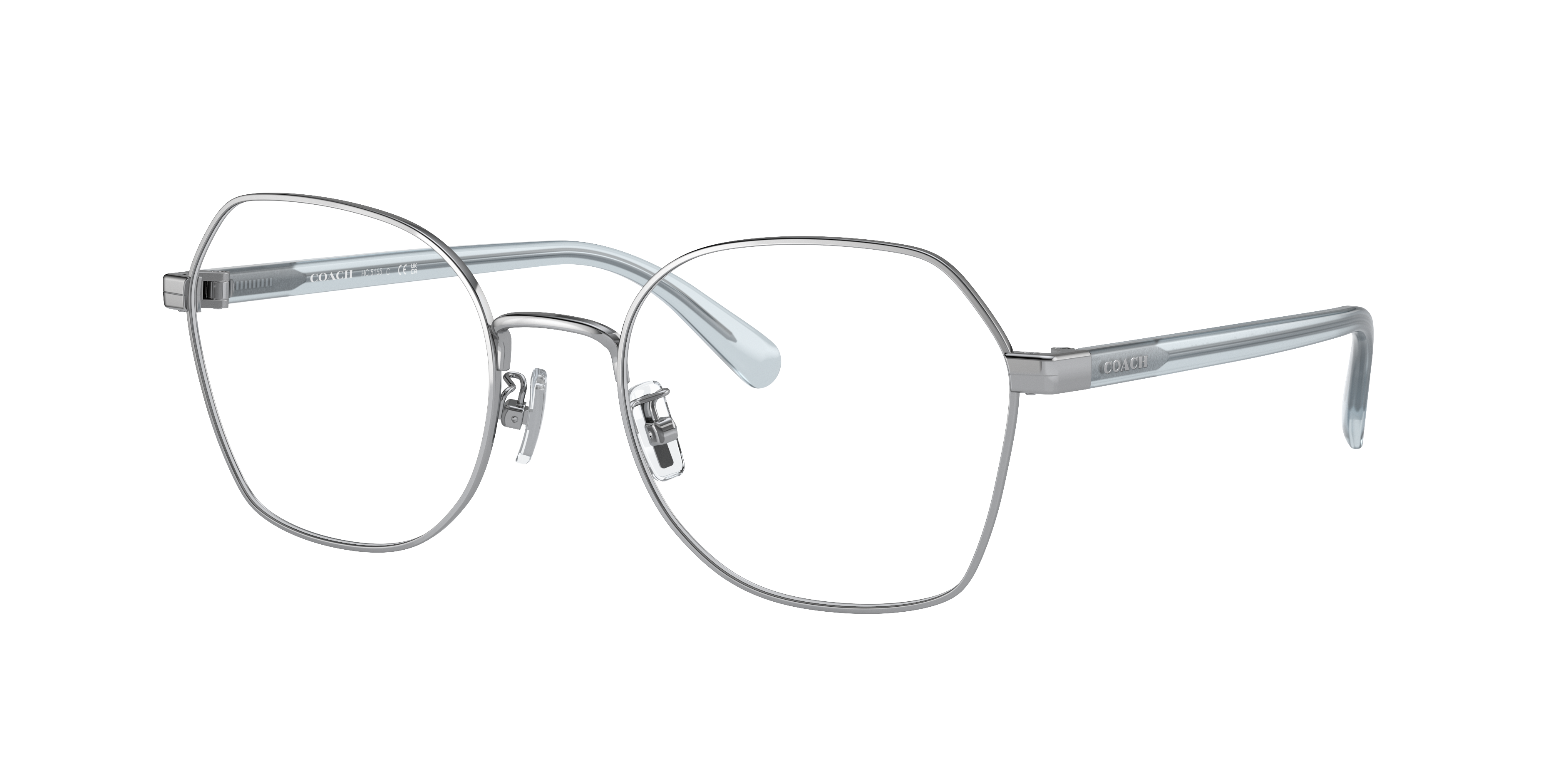 Elevate your fashion and enhance your vision with Coach HC5155 eyeglasses. The irregular shape of the metal frame adds a unique twist to a traditional design. The polished shiny silver finish gives these glasses a sleek and modern look. These frames are not only stylish but also versatile, making them an excellent addition to any eyewear collection. Available with prescription lenses.