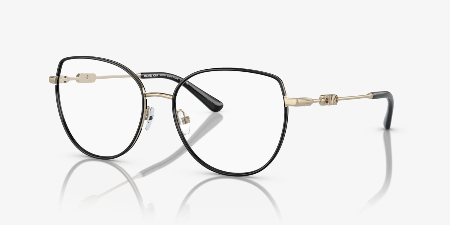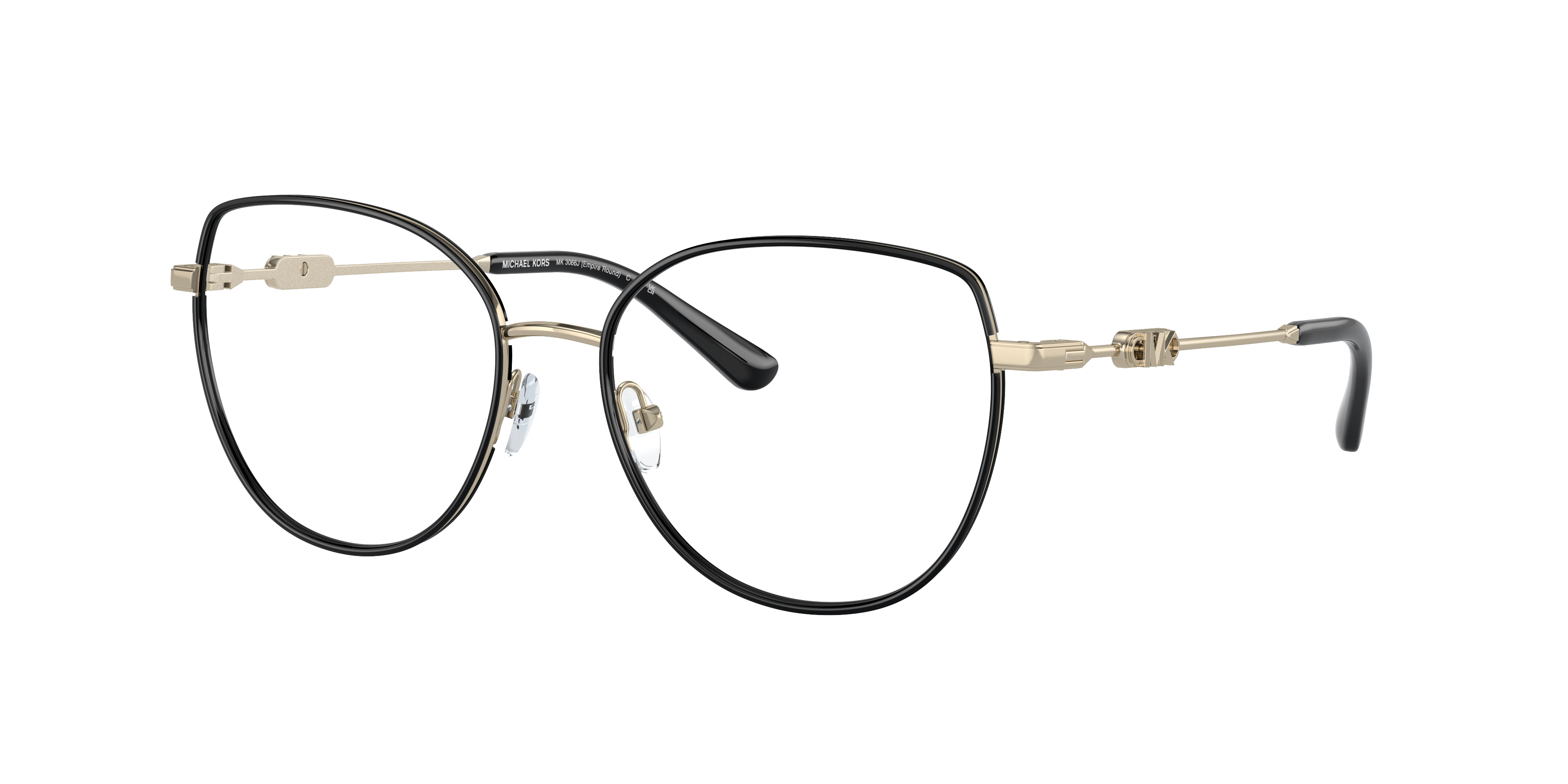 Elevate your style with Michael Kors Empire Round eyeglasses. The irregular shape and polished light gold/black frame color offer a unique and modern twist to a timeless design. Crafted from durable metal, these glasses are designed to last. Embrace your individuality while staying on trend with these stylish eyewear pieces.