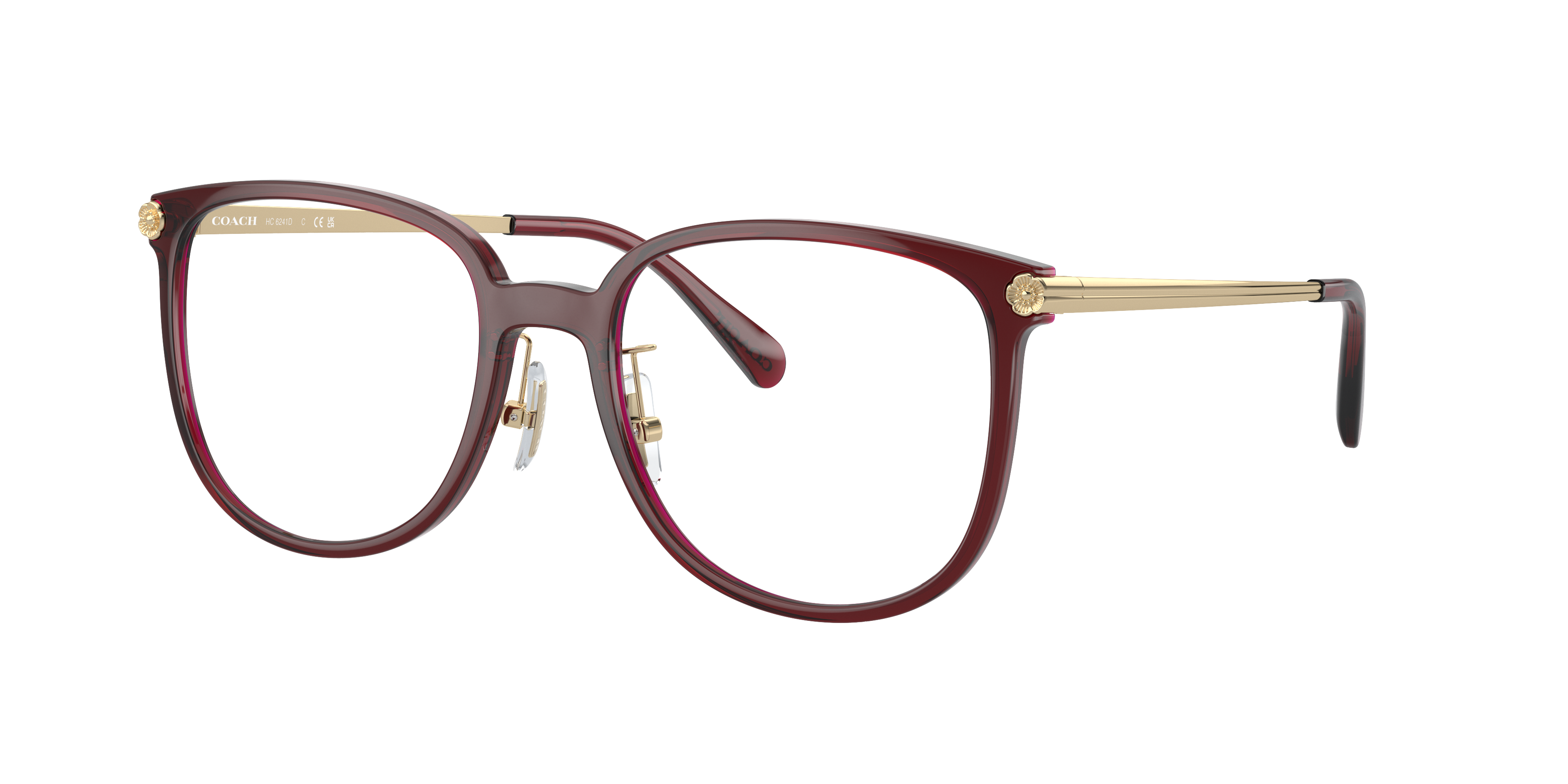 Elevate your style while maintaining a high level of comfort with Coach HC6241D optical glasses. The square shape and polished transparent burgundy frame, paired with the saddle bridge, provide a comfortable and stylish fit. These shades feature a unique design that is both fashionable and functional. With these glasses, you can express your individuality in style. Available with prescription lenses.
