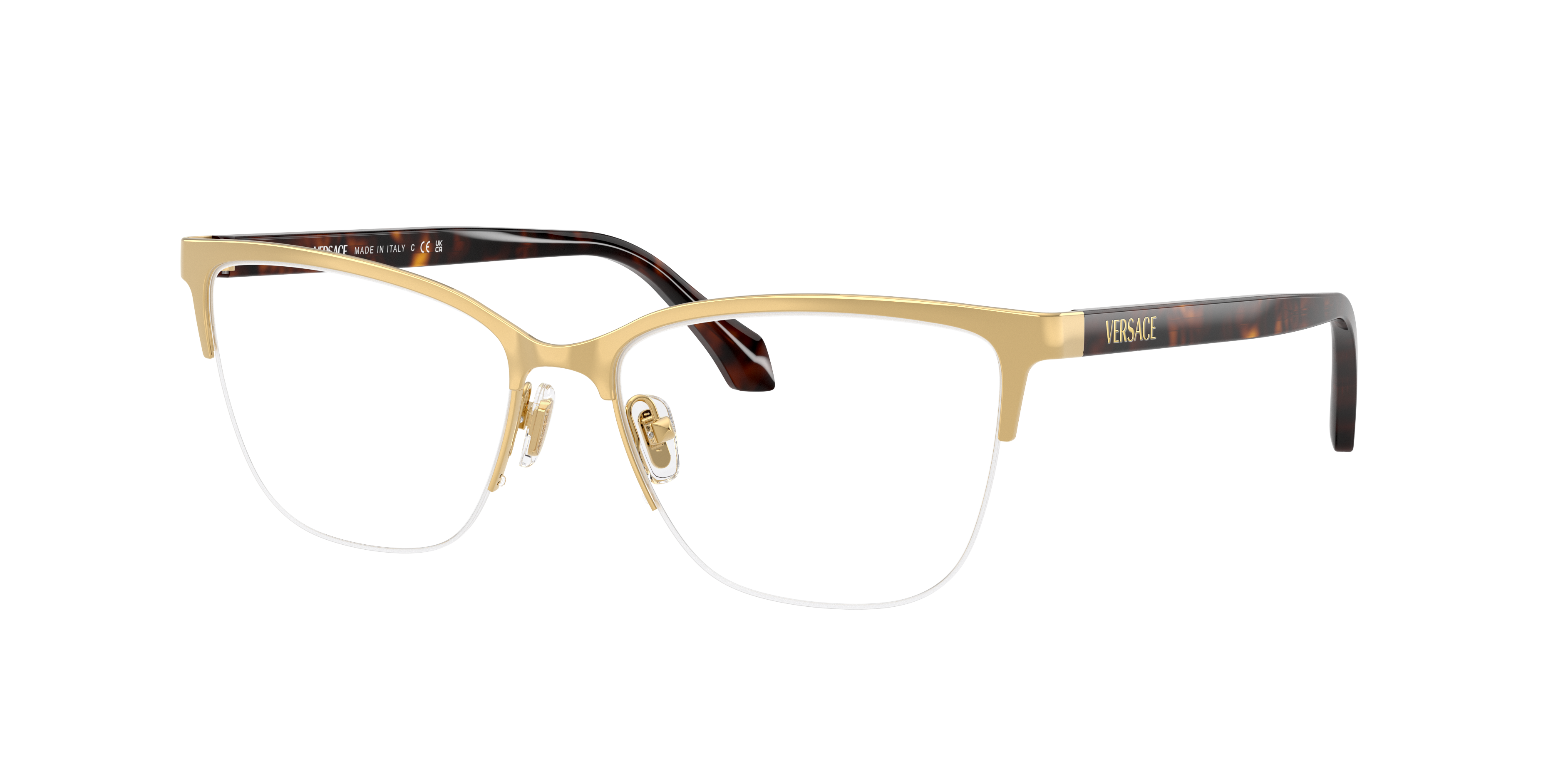 Elevate your fashion and optical standards with Versace VE1304. These cay-eye glasses features a polished gold metal frame that exudes elegance and sophistication. The frame color finish adds a touch of glamour, making these shades a must-have accessory for any fashion-forward individual. Embrace your unique style with these stunning frames. Available with prescription lenses.