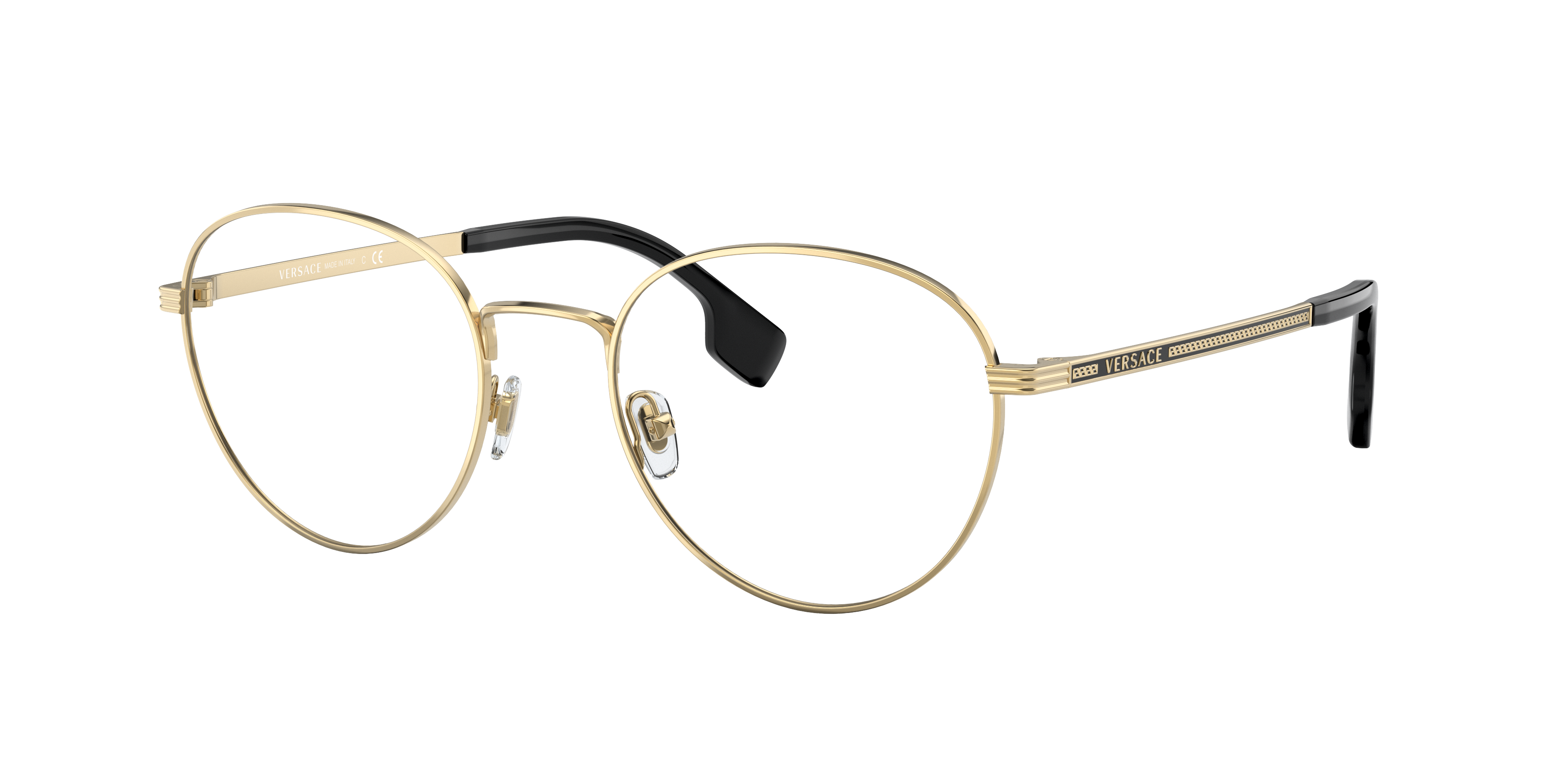 Experience the epitome of luxury and precision with Versace VE1279 eyeglasses. Crafted from durable steel, these glasses feature a polished gold frame in a unique phantos shape that adds a touch of sophistication to any look. The gold color finish is complemented by the black temples for an elegant yet edgy aesthetic. Embrace the timeless appeal of Versace eyewear and showcase your individual style with these stunning shades. Available with prescription lenses.