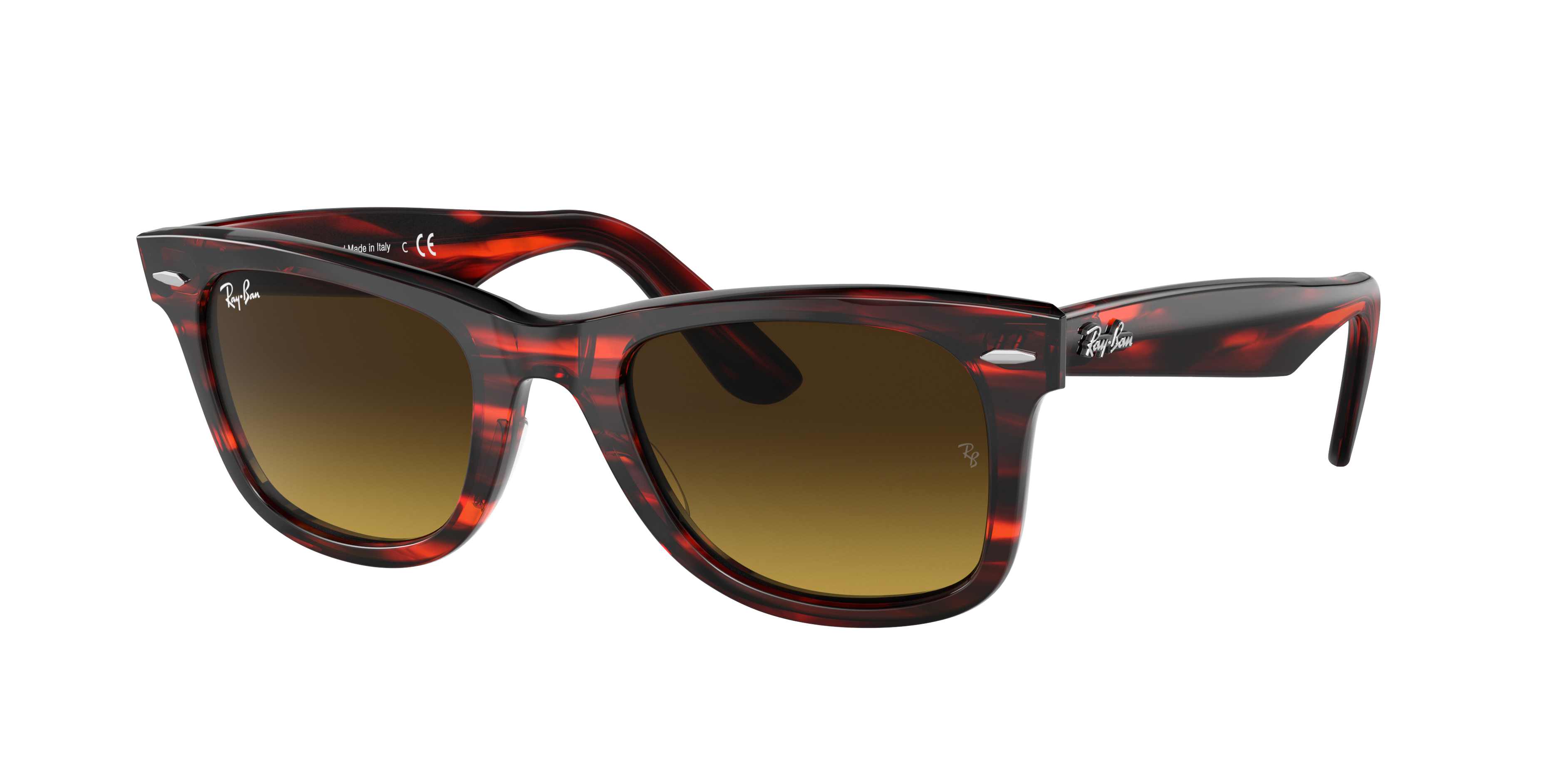 Experience the perfect blend of style and comfort with Ray-Ban Original Wayfarer Bio-Acetate sunglasses. These square-shaped frames are crafted from durable acetate, and polished to a high shine for a luxurious look. The striped red frame color adds a pop of color to your everyday style, while the brown gradient lenses provide optimal clarity in any light condition. These glasses are not only stylish but also practical. Available with prescription lenses.