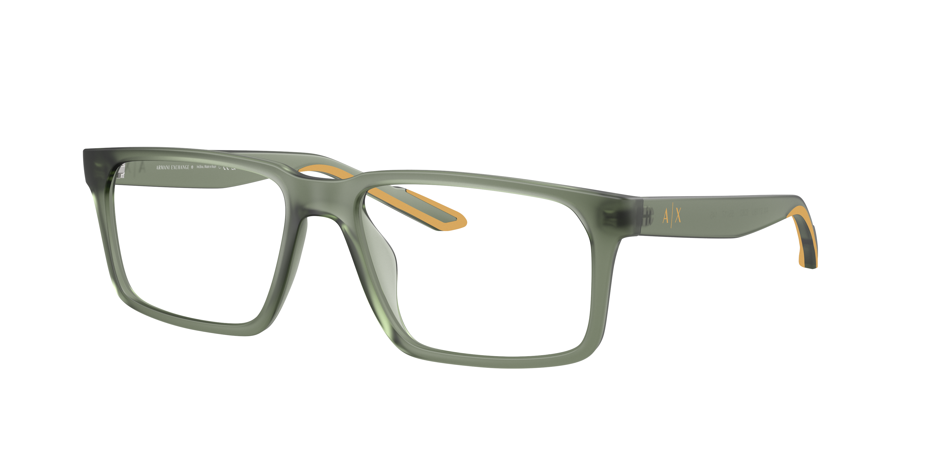Elevate your fashion quotient with these Armani Exchange AX3118U eyeglasses. The matte opalescent green frame, paired with a rectangle shape, gives these specs a modern and sophisticated look. The frame color is complemented by the black lenses, creating a striking contrast that is sure to turn heads. These glasses are not only stylish but also practical, making them the perfect accessory for any outfit. Available with prescription lenses.