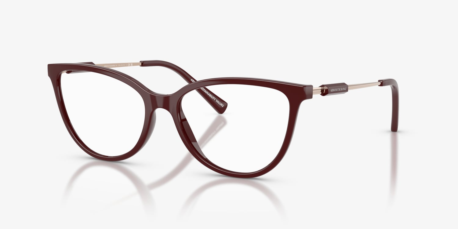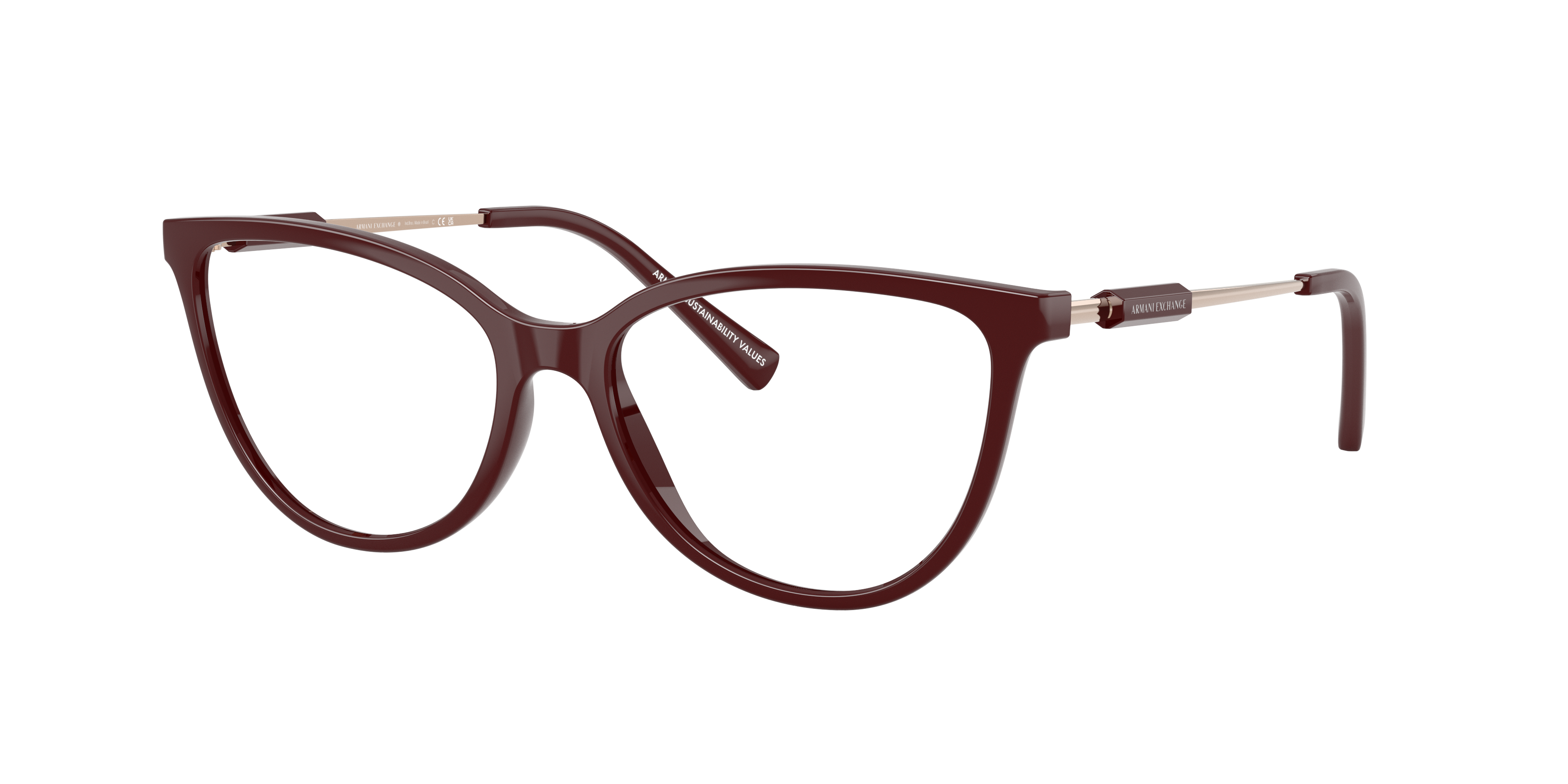Introducing Armani Exchange AX3128 optical frames, a perfect blend of style and comfort. The polished shiny bordeaux frame, in a distinctive cay-eye shape, adds a touch of sophistication to any look. These glasses features a unique design that is both timeless and contemporary. Experience the versatility and elegance of these stunning shades. Available with prescription lenses.