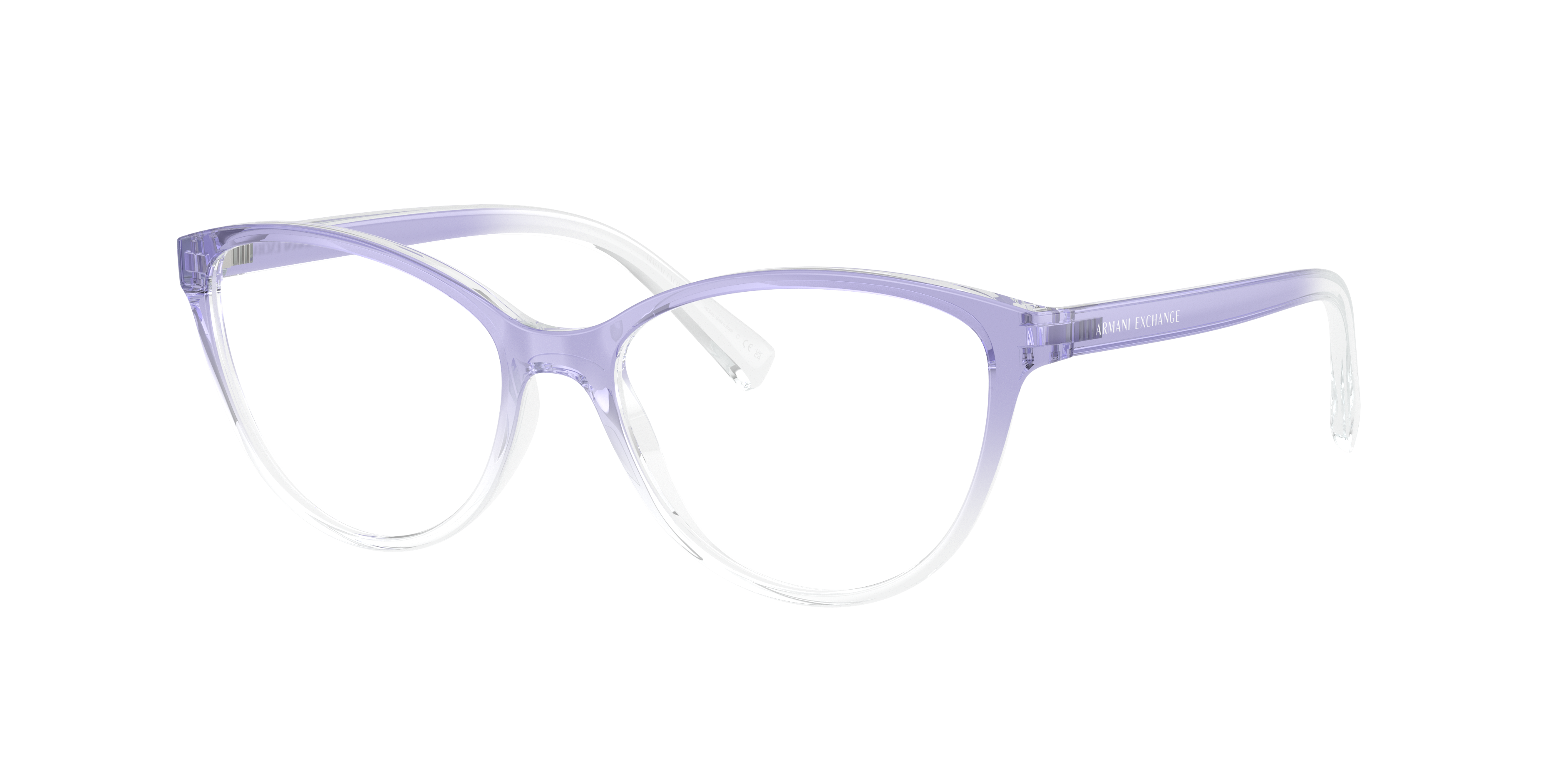 Elevate your style game with Armani Exchange AX3053 eyeglasses. The pillow shape and polished, shiny lilac gradient crystal frame color offers a modern and sophisticated look. The frame color also comes in a polished black finish, providing versatility for any outfit. These glasses are not only stylish but also practical. Embrace the synergy of fashion and function with these chic frames. Available with prescription lenses.