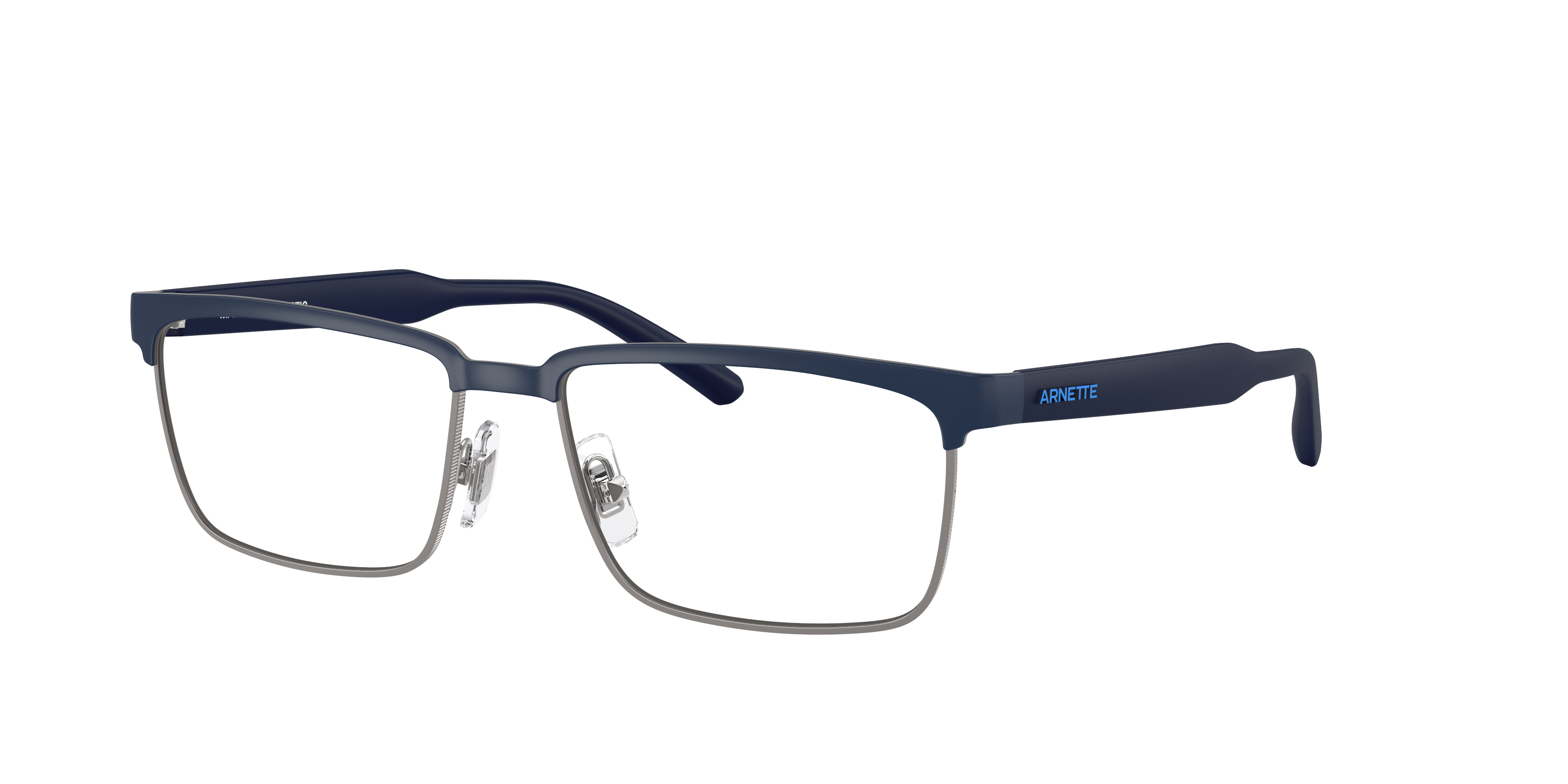 Discover the flawlessly balanced union of style and functionality in Arnette Mokele glasses. Crafted from durable metal, these rectangle-shaped frames come in a matte dark blue color that adds a touch of sophistication to any look. The black and silver detailing on the temples adds a unique, modern twist. These shades are not only stylish but also practical. Available with prescription lenses.