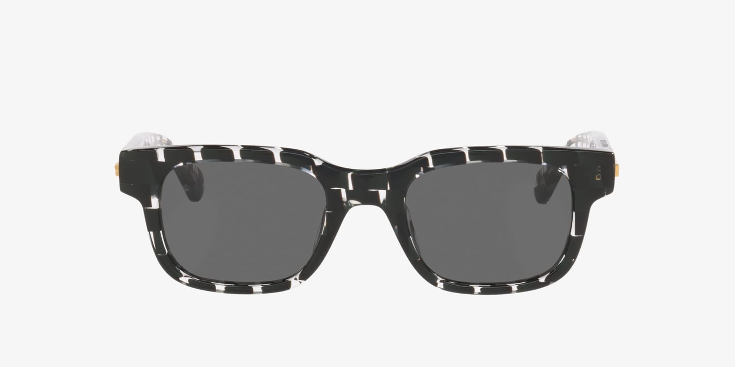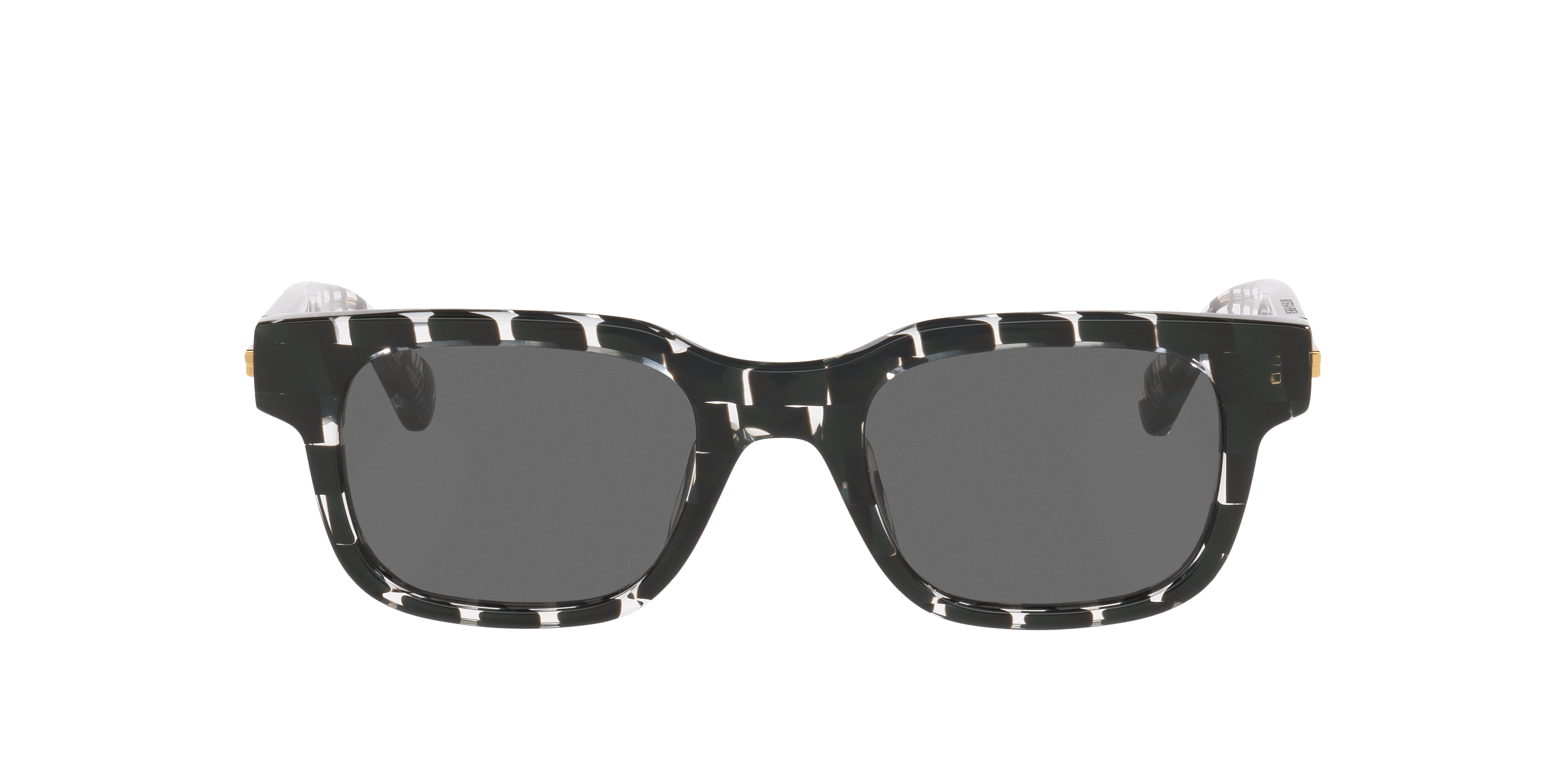 The Bottega Veneta BV1411S sunglasses feature sleek rectangular frames crafted from durable plastic for a refined look. The black sunglasses frame front pairs effortlessly with solid grey lenses, offering a modern aesthetic. Acetate temples add a polished touch, enhancing the sophisticated design of these stylish Bottega Veneta sunglasses.