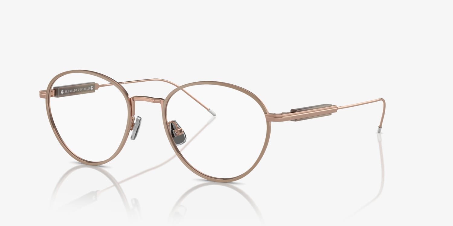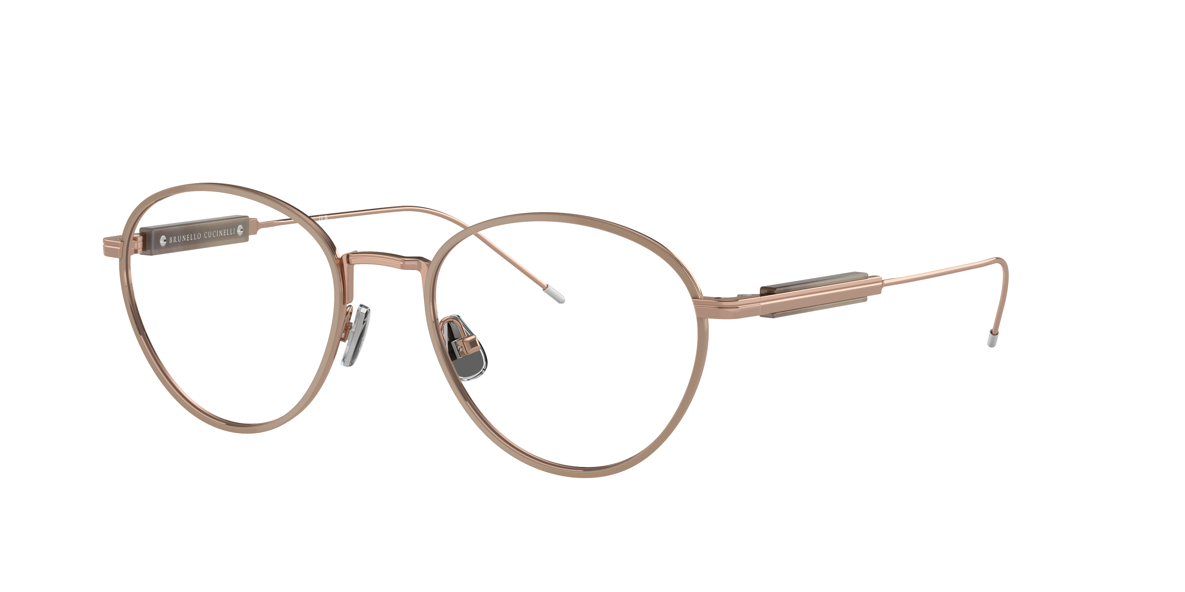 Elevate your style quotient with Brunello Cucinelli BC1003T optical glasses. These frames, crafted from titanium, are lightweight and durable for comfortable all-day wear. The polished rose gold/camel color finish adds a touch of elegance to your look. The phantos shape and titanium frame material make these glasses a versatile choice for everyday wear. Embrace the luxury and sophistication of Brunello Cucinelli with these exquisite optical frames. Available with prescription lenses.