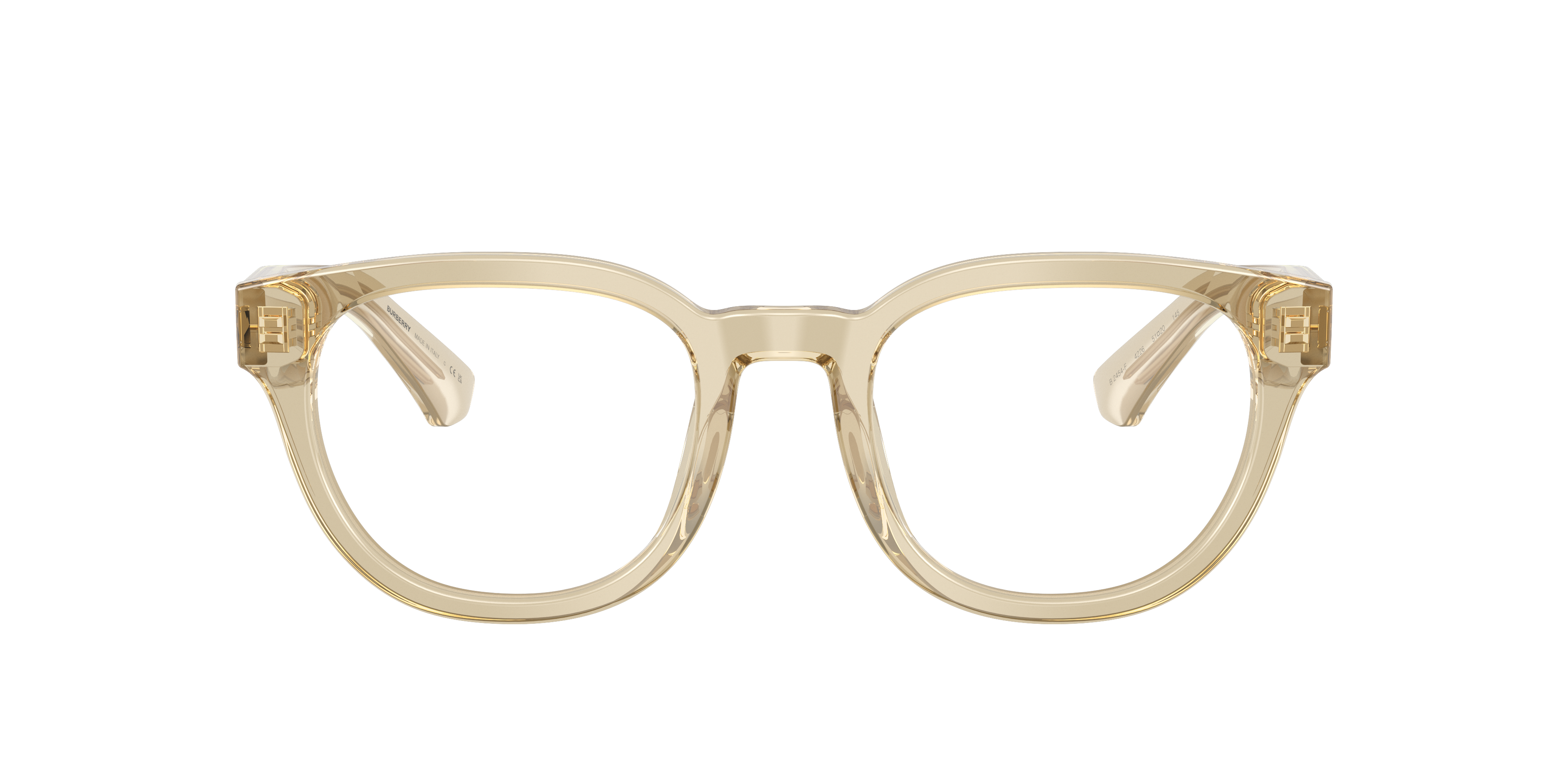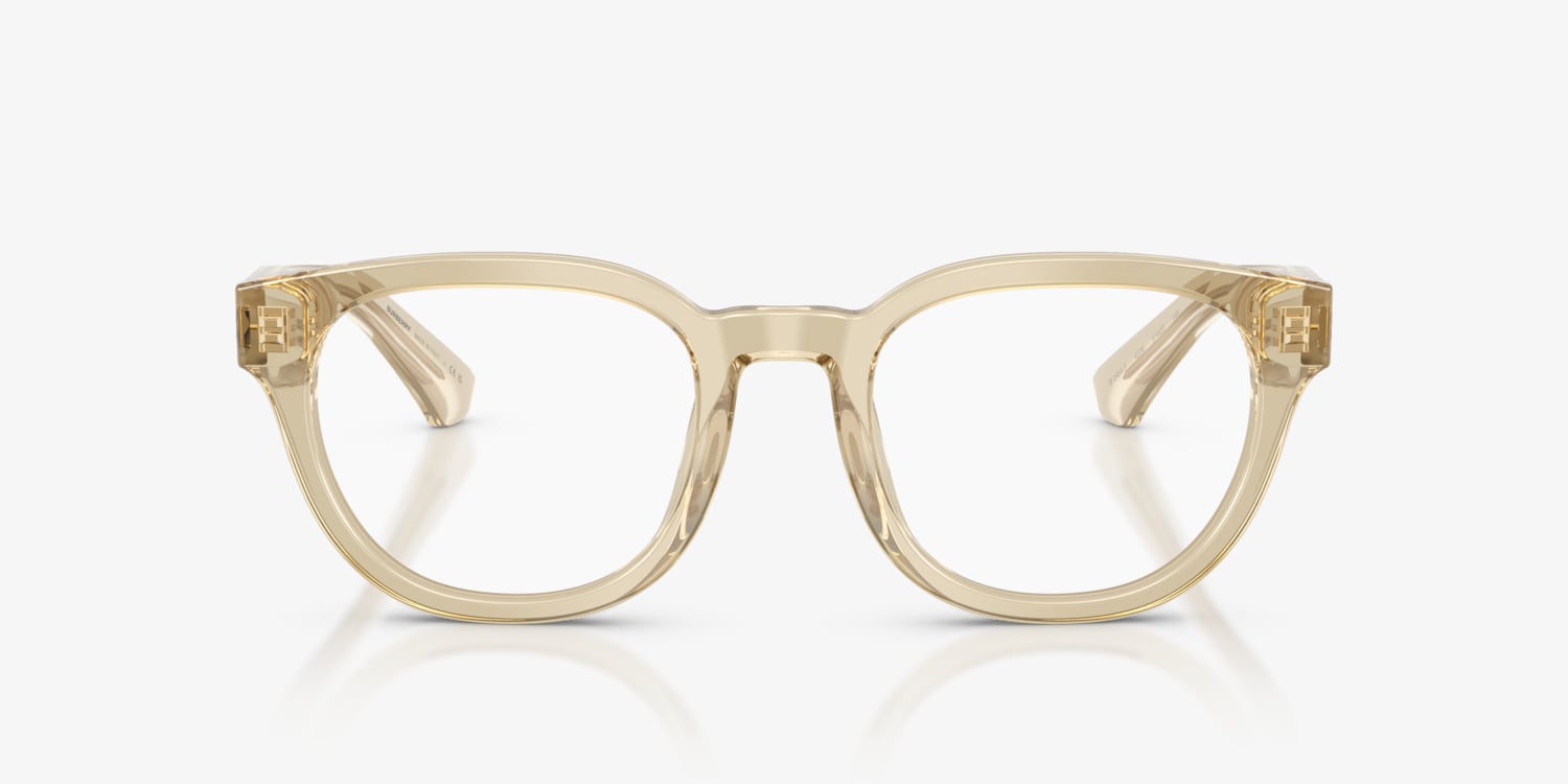 Timeless yet modern, the Burberry BE2454 optical frames blend retro-inspired round glasses shapes with innovative details. Crafted from bio-based acetate with at least 50% plant-based content, they deliver a sustainable touch. The layered temple design reveals a polished metal core, engraved with iconic Burberry logos for a refined finish. Their brown and tan tones are sophisticated, paired with clear lenses for a versatile look—a perfect choice for those seeking elegant Burberry eyeglasses.