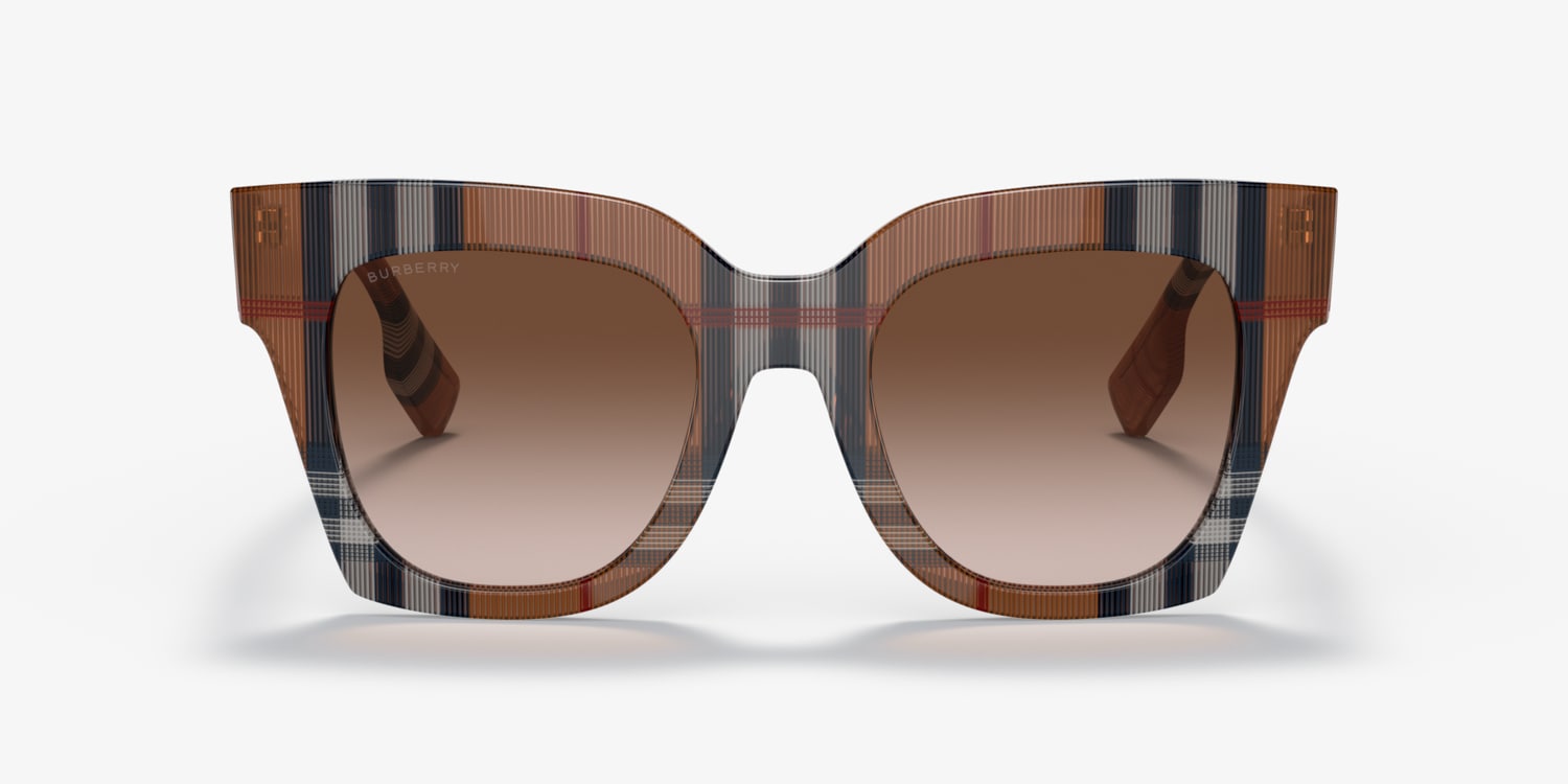 Elevate your fashion while optimizing utility with Burberry Kitty sunglasses. The square shape and polished brown check acetate frame offer a sophisticated look. These glasses feature brown gradient lenses, providing a smooth transition from a darker shade at the top to a lighter shade at the bottom. The lenses adds a trendy touch to your style, making these shades perfect for any occasion.