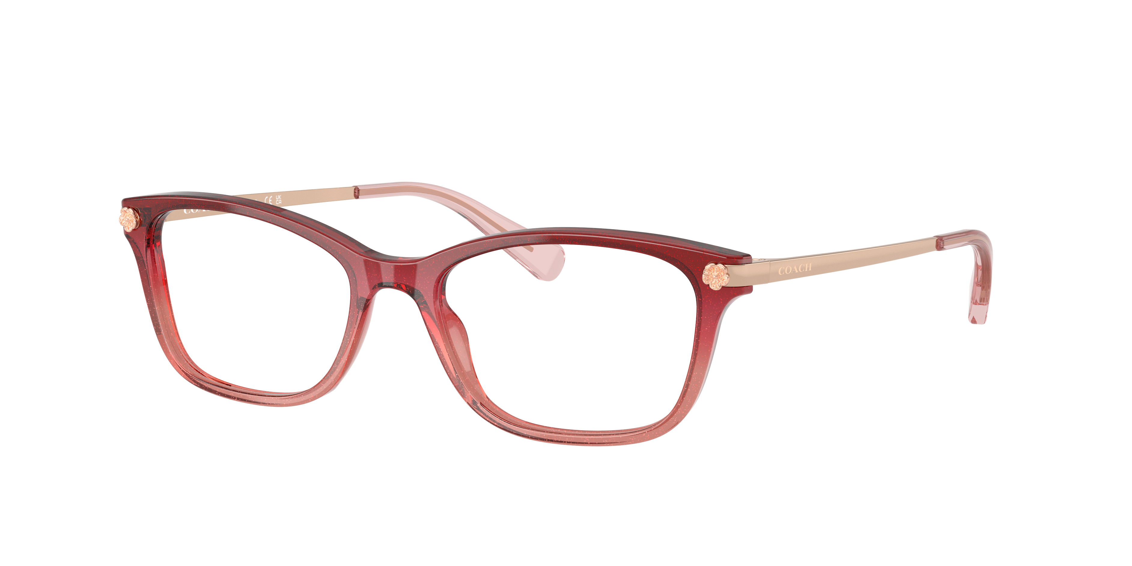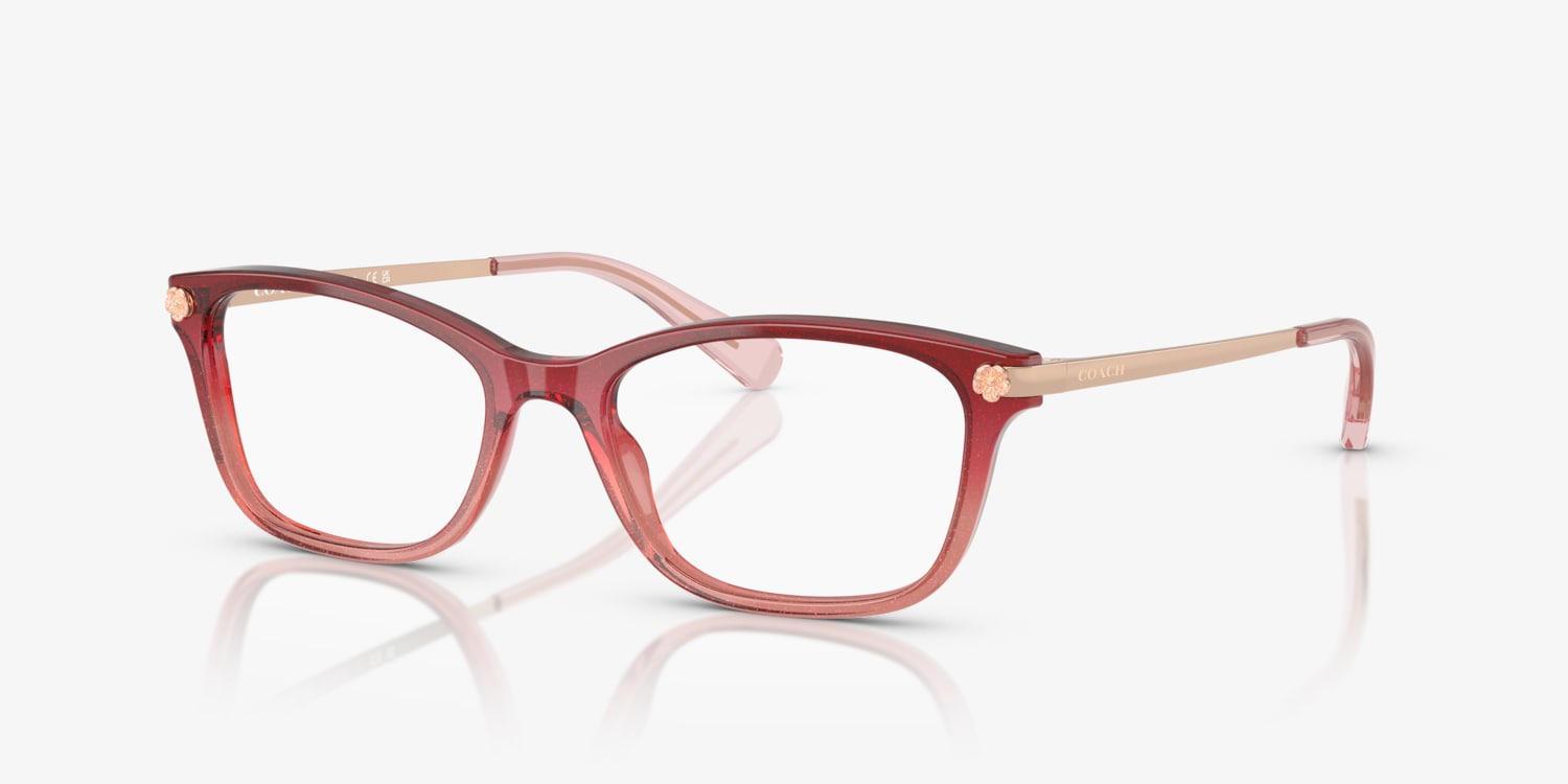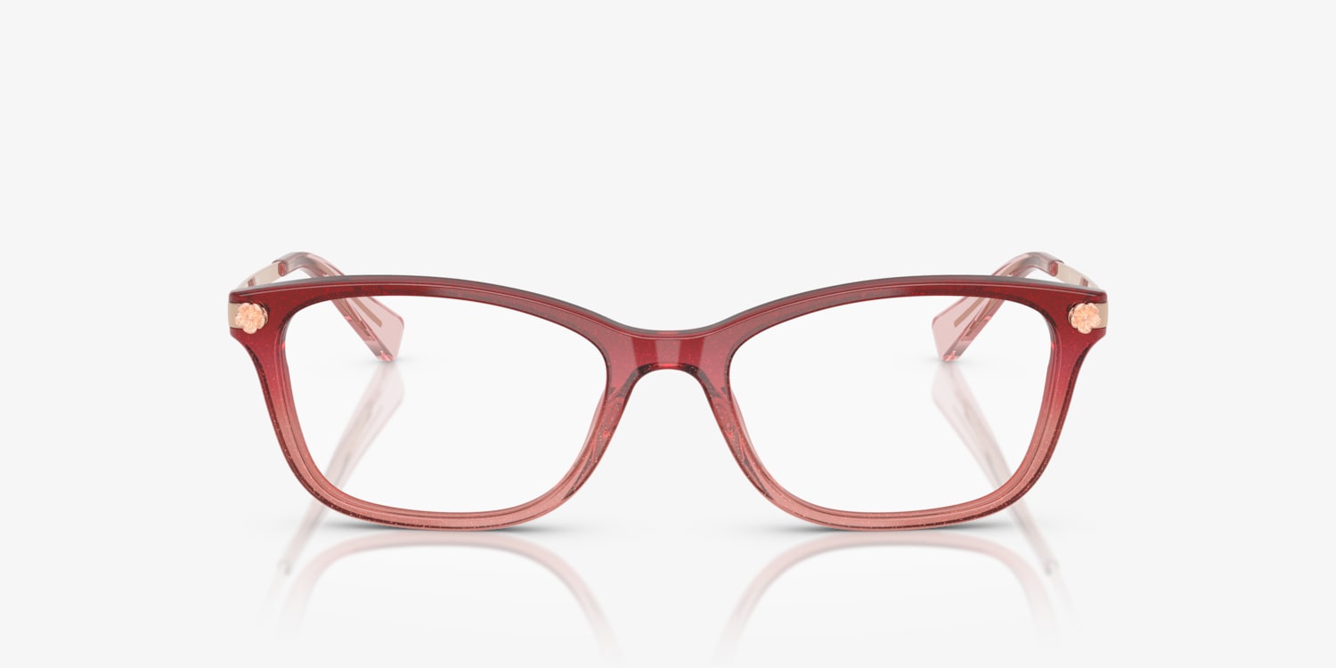 Elevate your fashion and vision standards with Coach HC6142 eyeglasses. The pillow shape, crafted from durable acetate, offers a unique twist on a timeless design. The polished finish in a rich burgundy pink glitter gradient adds a touch of glamour to any look. These frames are not only stylish but also versatile. Embrace the power of choice with Coach HC6142 eyewear. Available with prescription lenses.