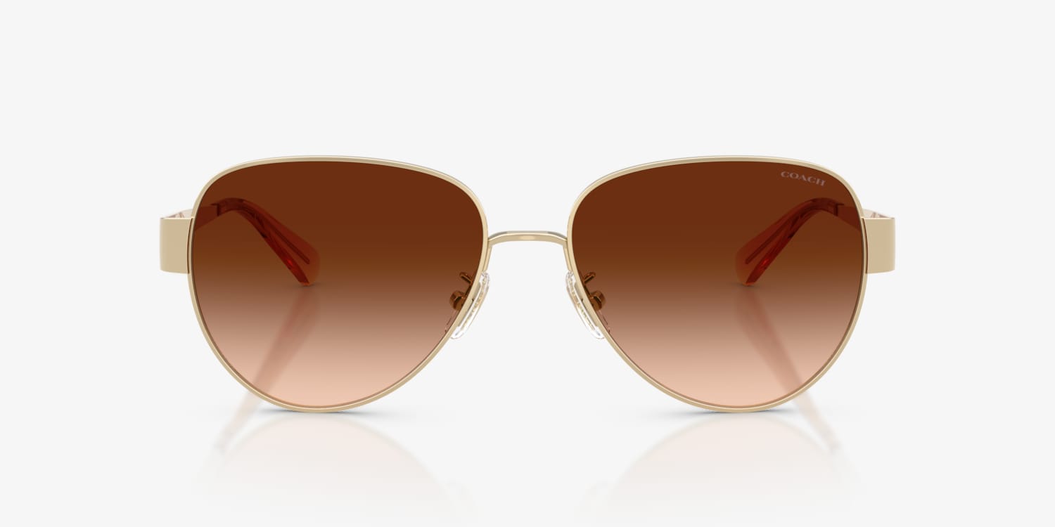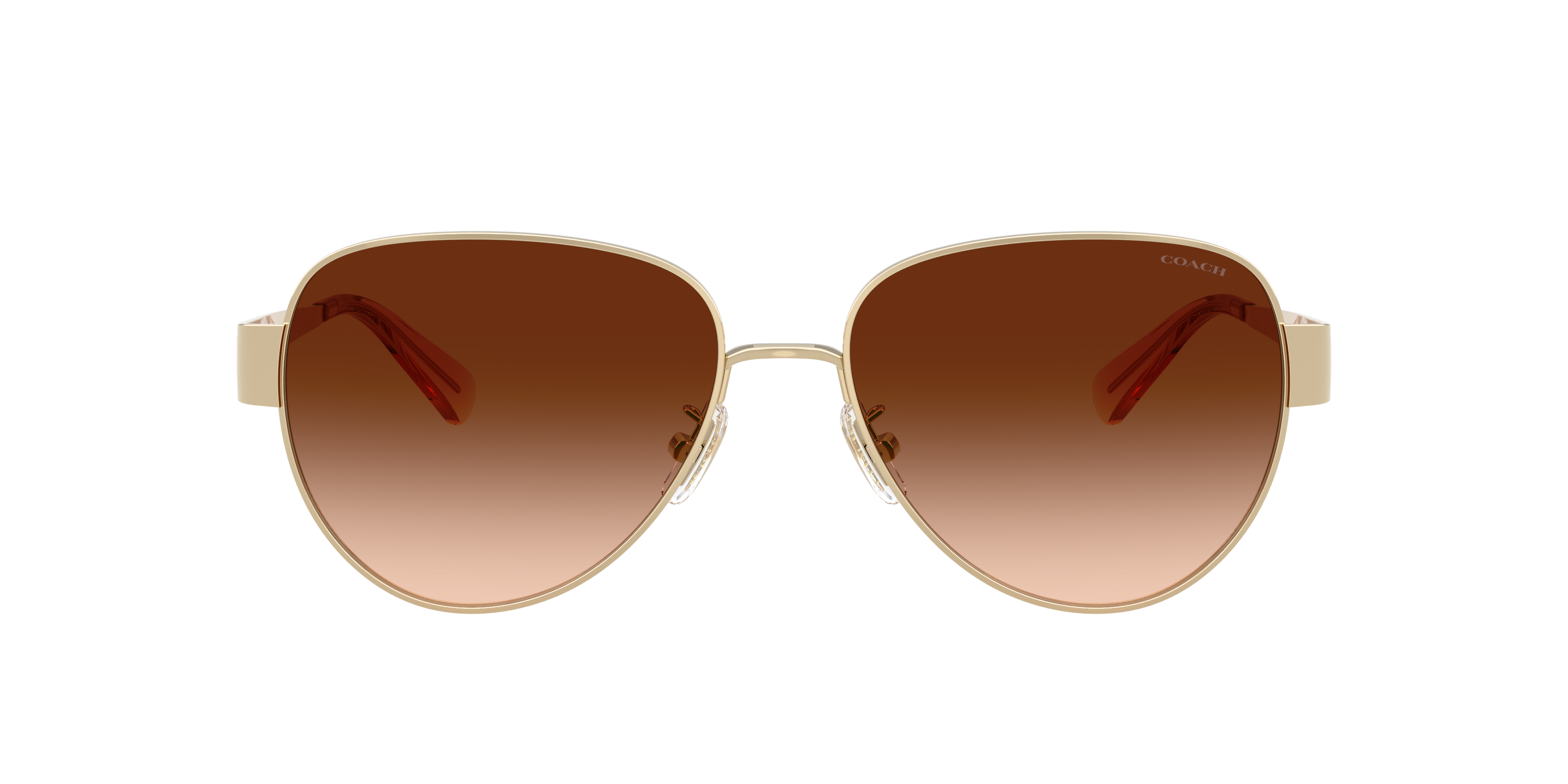 Elevate your style with the Coach HC7186 CDP37 sunglasses, inspired by the timeless elegance of the Coach Idol bag. The sleek aviator frames are crafted from lightweight metal and feature a classic saddle bridge with adjustable nosepads for a comfortable fit. Gradient sunglasses with brown lenses add a modern touch and offer versatile wear, while the polished gold sunglasses frame front exudes luxury. Perfect for those seeking sophisticated design with earthy, tonal color accents.