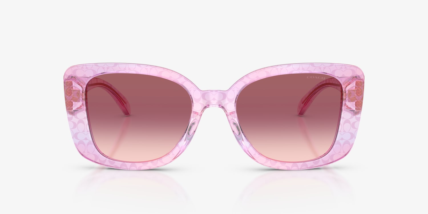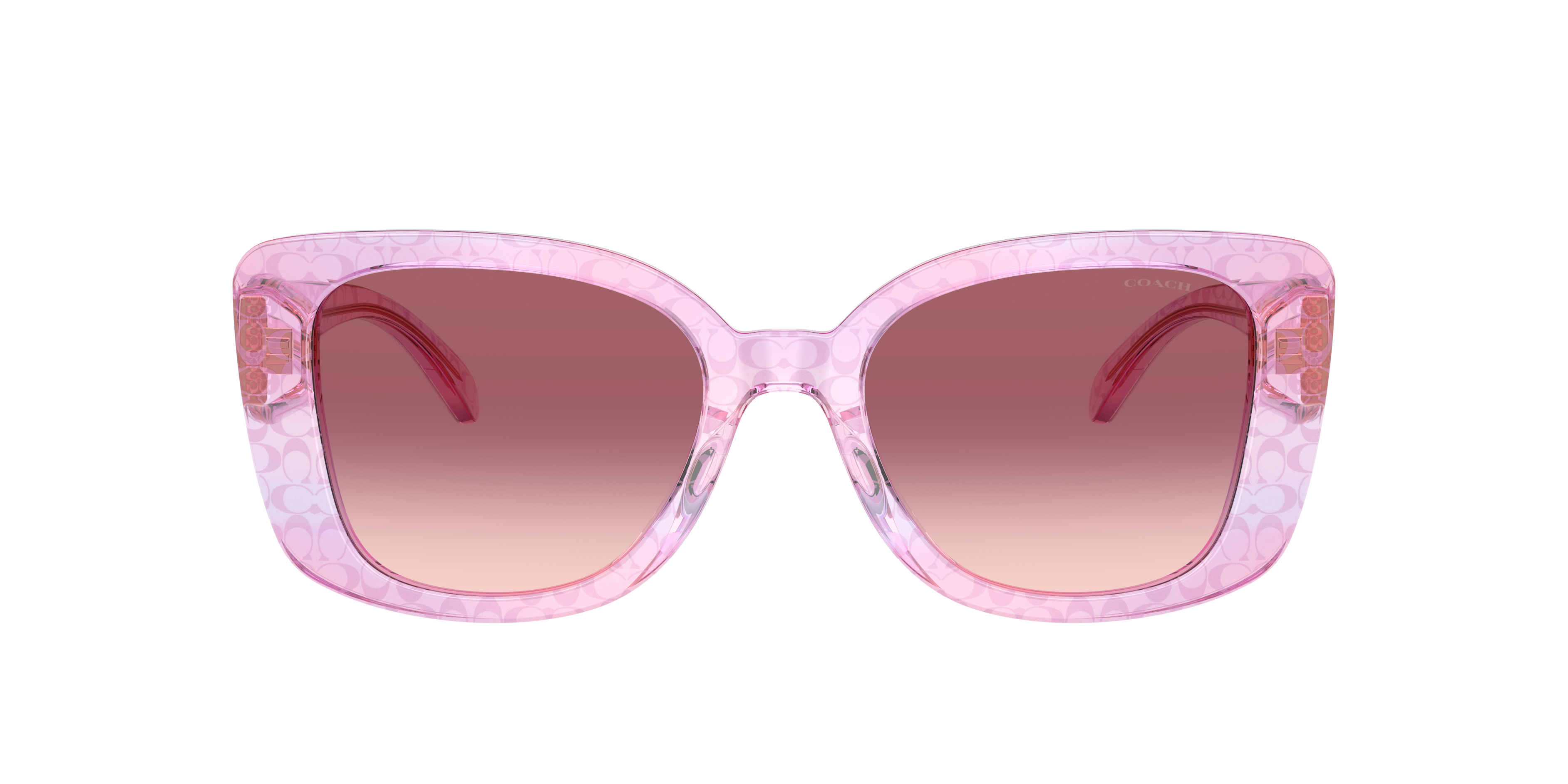 Embrace bold femininity with the Coach HC8450U CDP48 sunglasses. These square sunglasses in pink and purple acetate showcase sharp lines and a subtle Signature C pattern, reflecting New York's distinctive attitude. Featuring a saddle bridge for a classic touch, the design is complete with violet gradient lenses for a modern and playful flair.