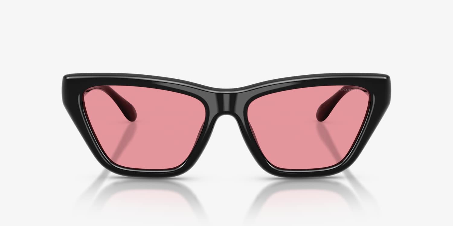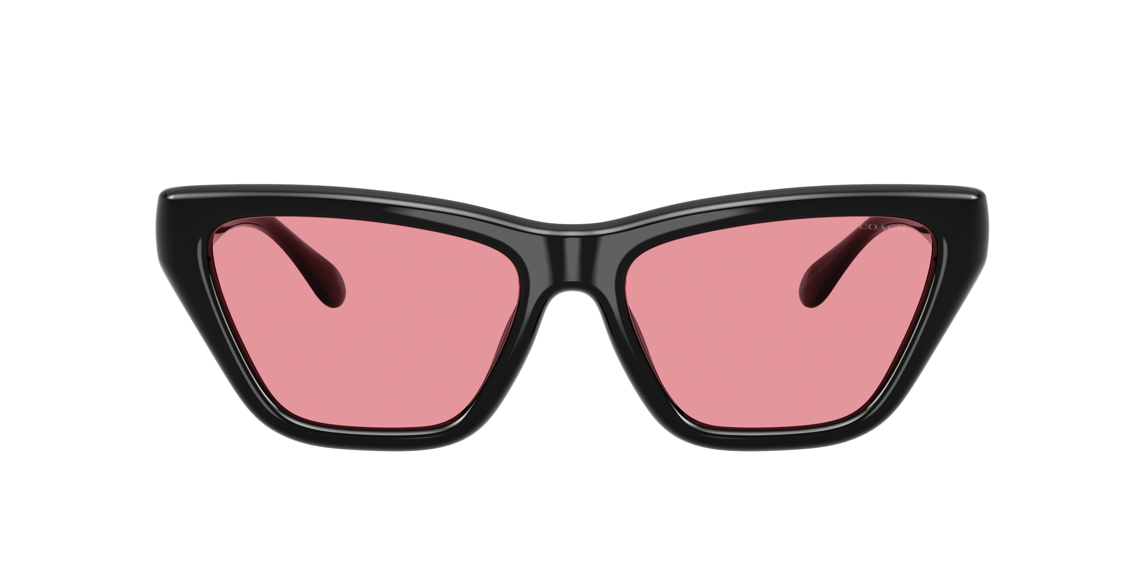 Elevate your style with the HC8449U CDP33 black sunglasses from Coach. Inspired by the iconic Pillow Tabby concept, these black plastic cat-eye frames offer angular edges and bold contours for a statement look. Sculpted injected temples enhance their design, while solid pink lenses add a modern touch. Designed with a standard bridge and sunglasses with a universal fit for effortless comfort.