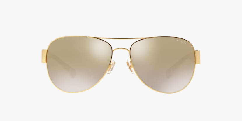 Elevate your style with Coach L138 sunglasses. These pilot-shaped glasses feature a polished gold metal frame, offering a sleek and sophisticated look. The gradient - mirror gold flash gradient lenses add an extra touch of glamour, while the gradual transition from darker to lighter tones provides a seamless finish. The luxurious gold finish on the frame adds an extra hint of luxury to any outfit. Available with prescription lenses.