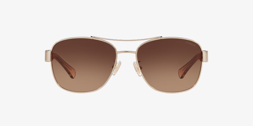 Elevate your fashion and vision standards simultaneously with Coach L151 sunglasses. The pilot shape, crafted from durable metal, is a timeless style that flatters all faces. The polished light gold frame adds a touch of glamour, while the brown gradient lenses provide optimal clarity and sun protection. These glasses are not only stylish but also versatile. Embrace the luxury and sophistication of Coach with these stunning shades. Available with prescription lenses.