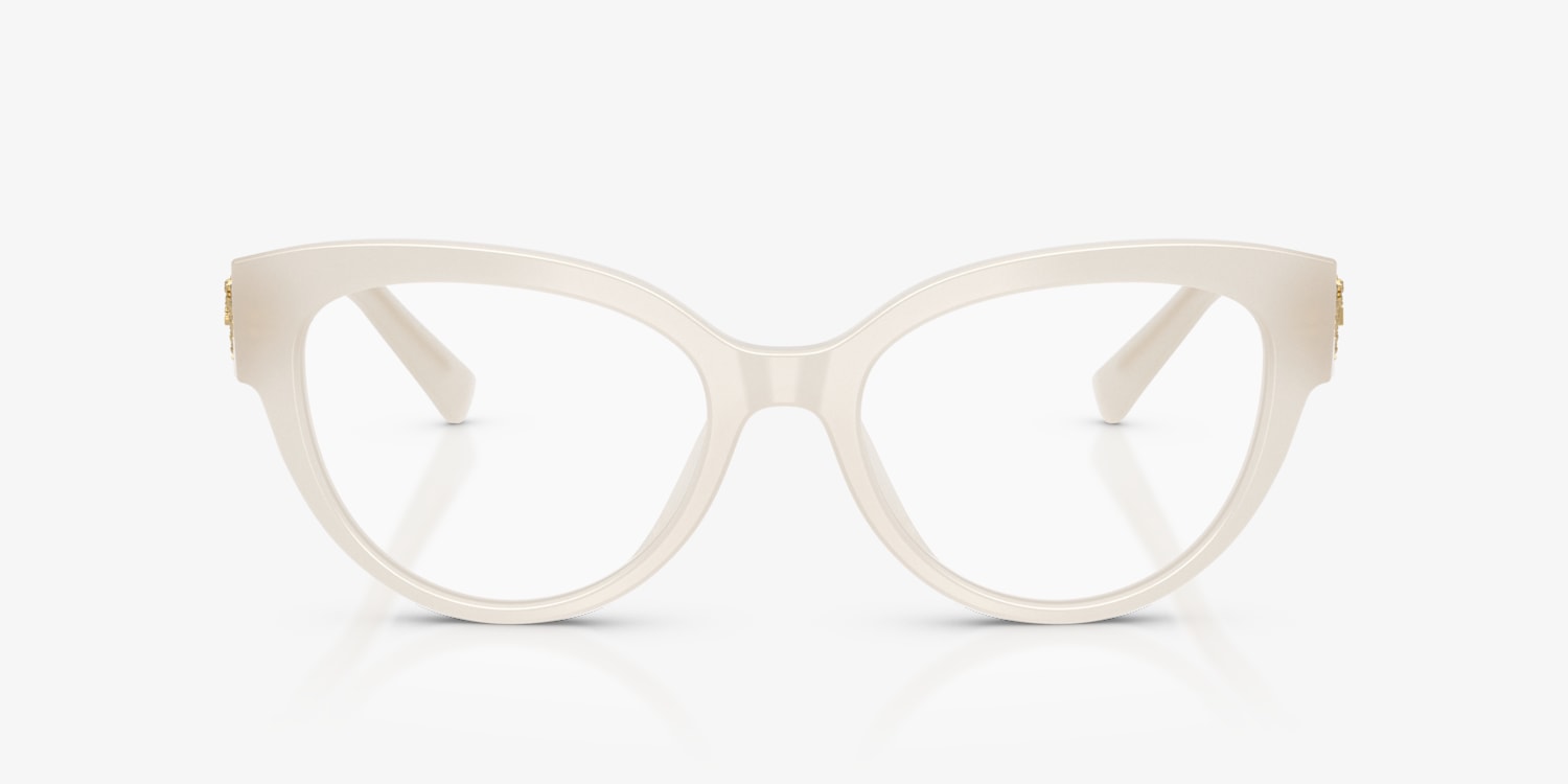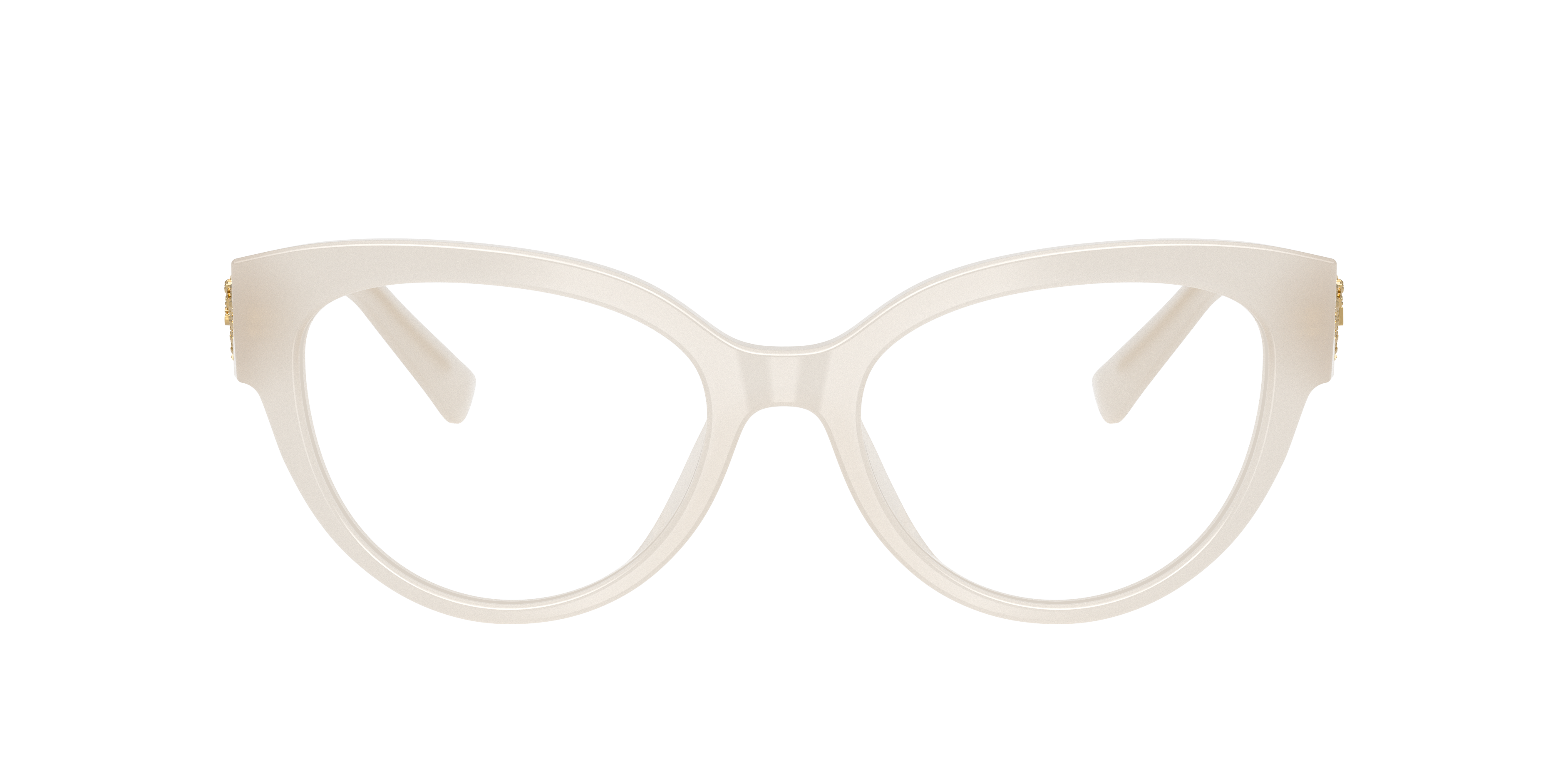 The Dolce&Gabbana DG3440 optical glasses feature elegant full-rim cat-eye frames crafted from lightweight plastic, offering universal fit eyeglasses and timeless sophistication. Adorned with the iconic Cuore Devotion emblem on wide acetate temples, these Dolce&Gabbana eyeglasses combine style and signature branding effortlessly. Finished with a chic white frame front and clear lenses, they balance boldness with refinement.