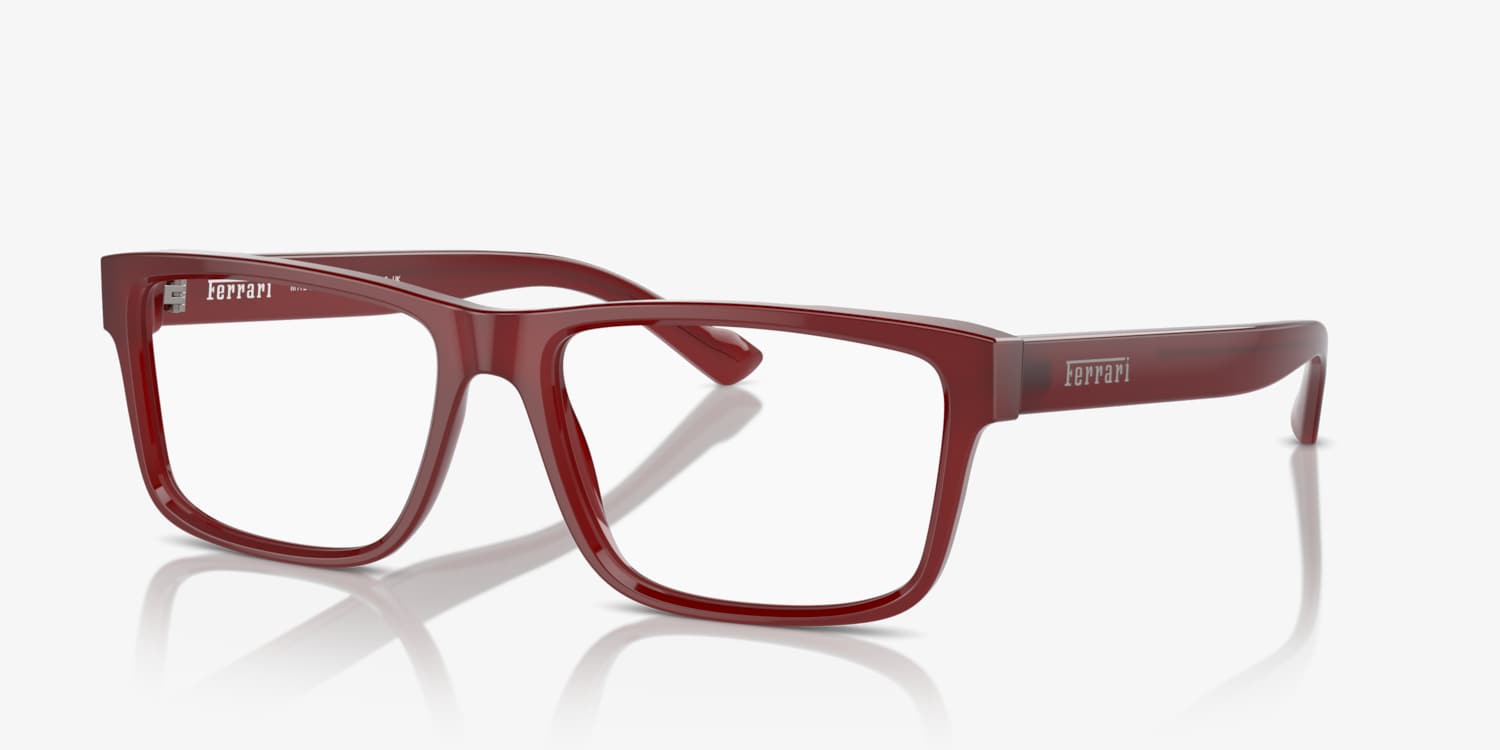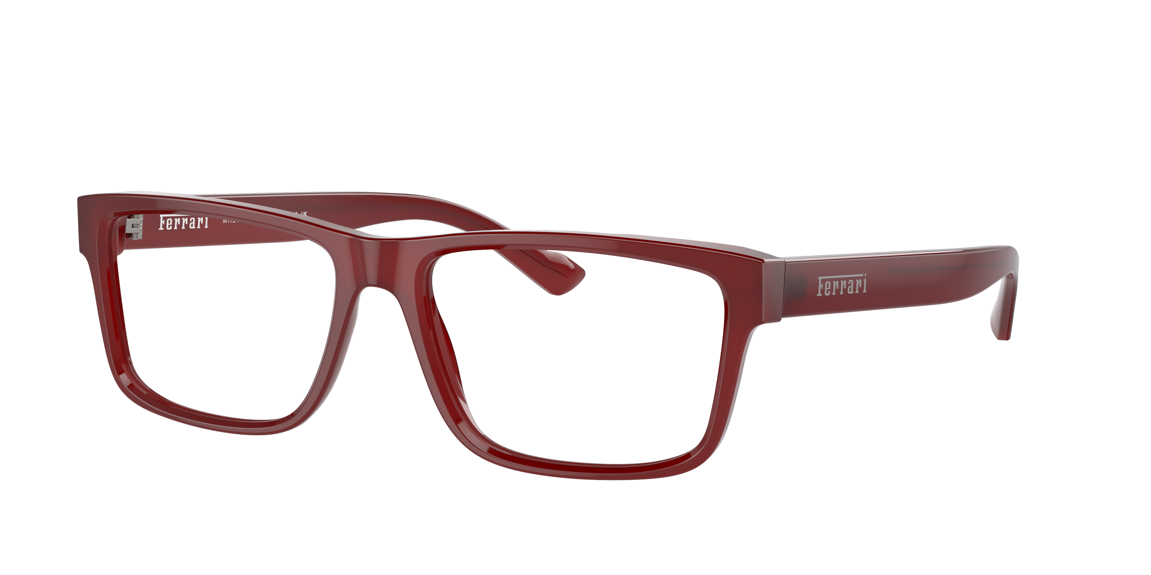 Experience the epitome of luxury and performance with Ferrari FH4001 optical glasses. The polished, transparent red acetate frame in a rectangle shape offers a modern twist on a timeless design. These glasses feature a unique design detail, showcasing the iconic Ferrari horse emblem on the temples. Designed for those who appreciate both style and comfort, these frames are an ideal choice for everyday wear. Available with prescription lenses.