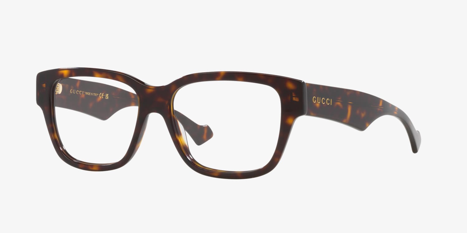 Experience the perfect blend of style and comfort with Gucci GG1428O eyeglasses. The square shape and tortoise brown frame color add a vintage touch to your look, while the shiny finish gives it a modern twist. Crafted from durable acetate, these frames are designed to last. The frame color is complemented by a black lenses, making them versatile for everyday wear. Available with prescription lenses.