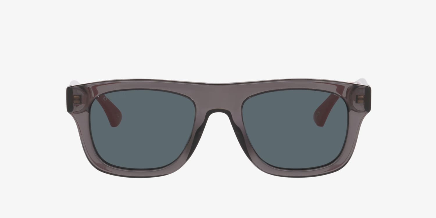 Elevate your style with the Gucci GG1991S sunglasses. Featuring sleek rectangular frames crafted from durable plastic and defined by their clean lines, these Gucci sunglasses add a structured touch to any look. The silver, gunmetal, and grey color blend on the frames offers a modern aesthetic, while the blue lenses provide a distinctive accent. Injected temples ensure lightweight comfort for all-day wear.