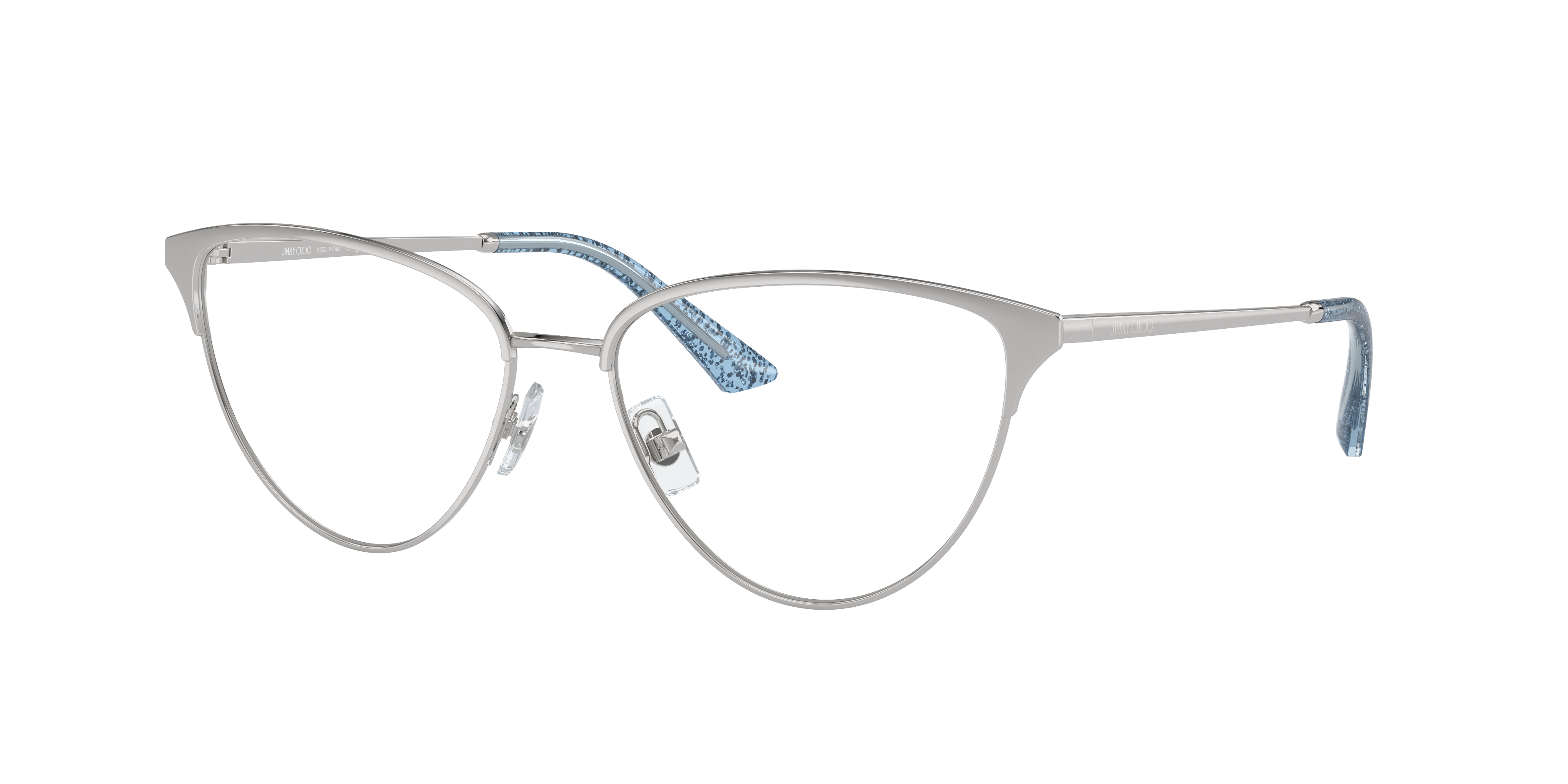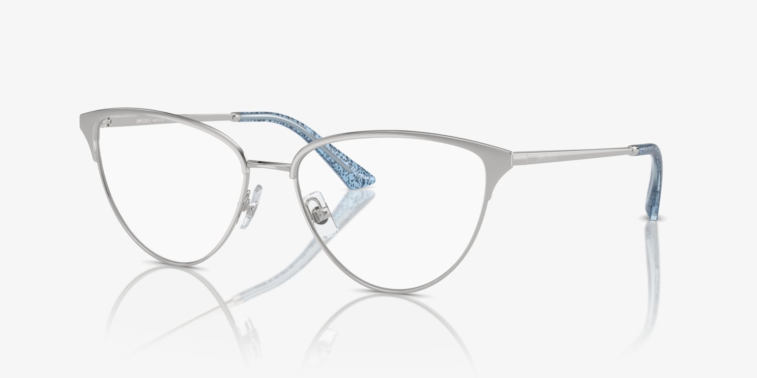 Elevate your style and optical performance with Jimmy Choo JC2002. These cat eye frames are crafted from high-quality metal, offering durability and a lightweight feel. The polished silver frame color adds a touch of elegance to any outfit. The shape and design of these glasses make them a versatile choice for everyday wear. Embrace the fashion-forward aesthetic of Jimmy Choo with these chic optical frames. Available with prescription lenses.