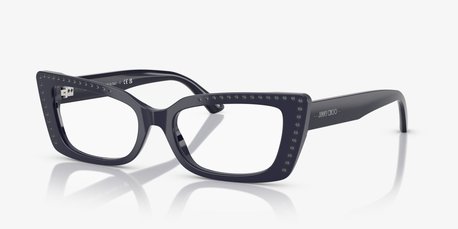 Show off your unique style with Jimmy Choo JC3018B. These cay-eye Optical features a polished blue/silver night frame made of durable acetate, and are adorned with strass for a glamorous touch. The black and silver color scheme adds a sophisticated edge to these stunning frames. Elevate your look with these unique Jimmy Choo shades. Available with prescription lenses.
