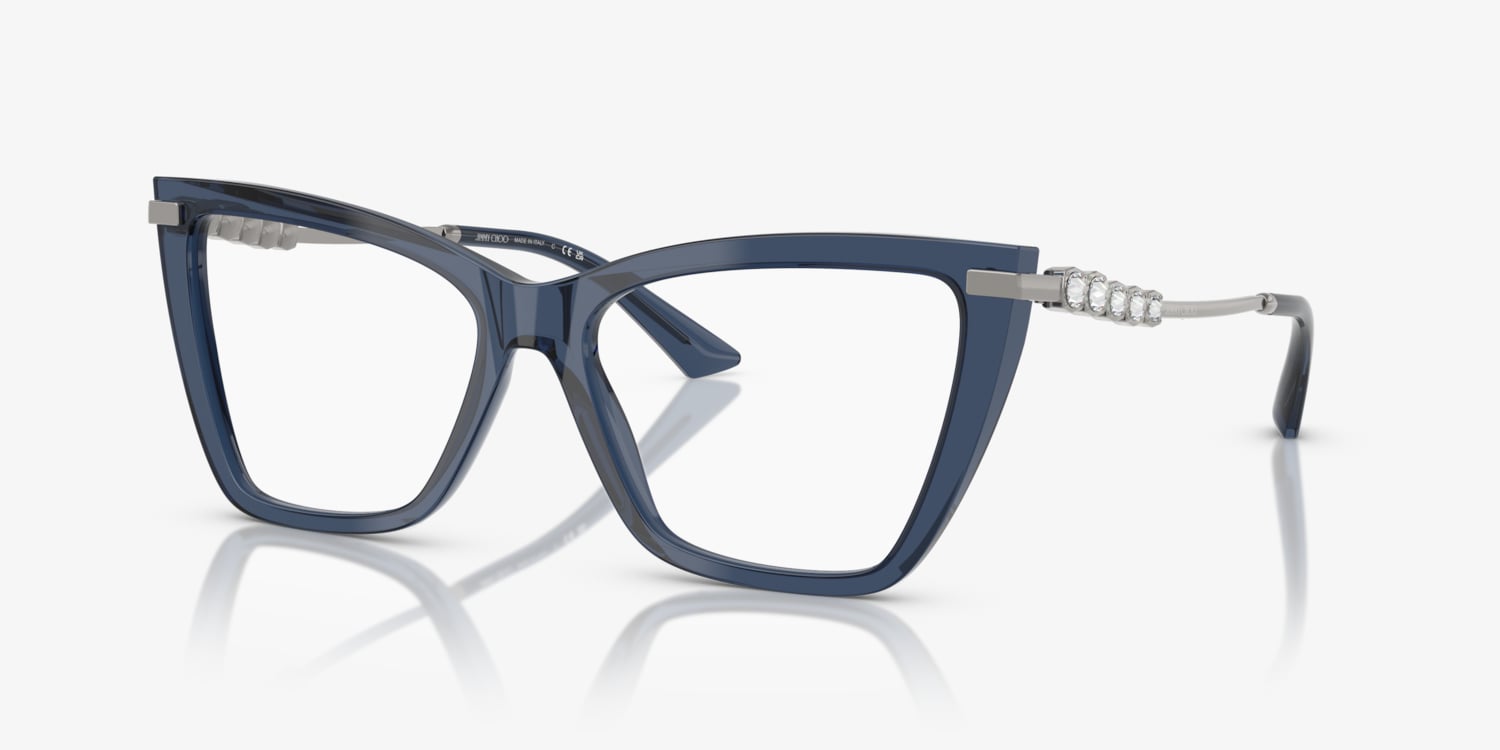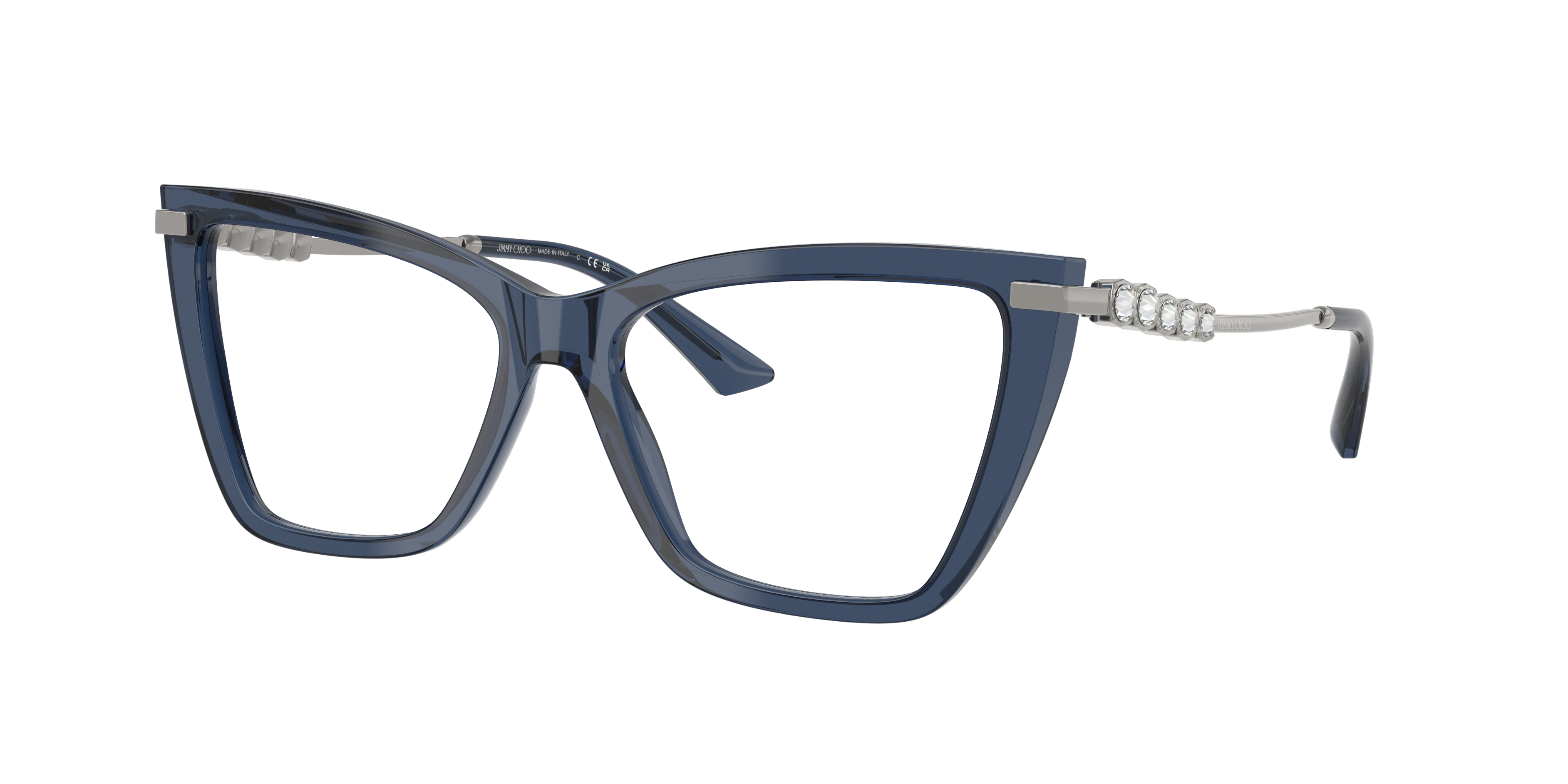 Embrace the playful side of your personality with Jimmy Choo JC3020B eyeglasses. Crafted from polished acetate, these cay-eye frames come in a vibrant blue color, adorned with strass for a glamorous touch. The unique shape and design make these shades as much a fashion statement as they are a practical accessory. Embrace your individuality and express your style with these exquisite Jimmy Choo glasses. Available with prescription lenses.