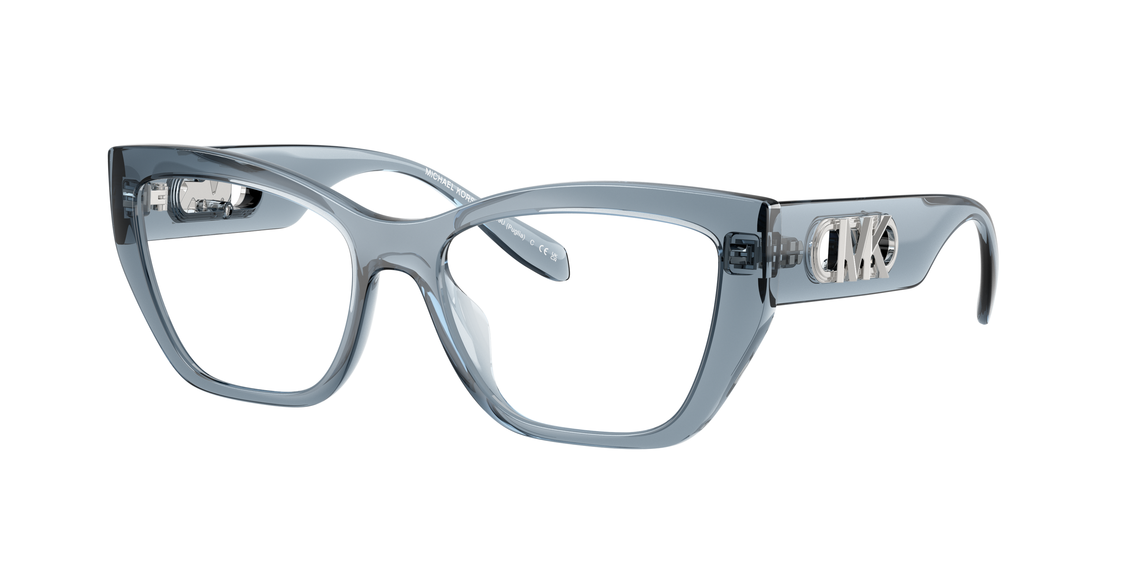 Elevate your fashion and optical utility with Michael Kors Puglia. The rectangle shape, combined with a polished denim transparent frame color, adds a touch of sophistication to any look. These glasses features a unique design detail with the contrasting black rim on the top of the frame, making them a standout accessory. The frame is also available in another color option, allowing you to choose the perfect pair to suit your style. Available with prescription lenses.