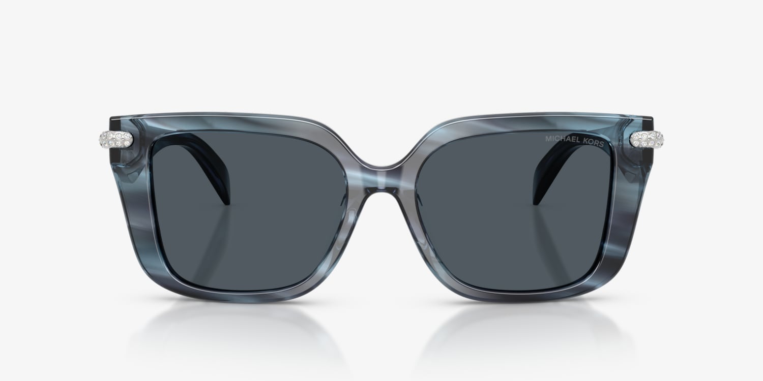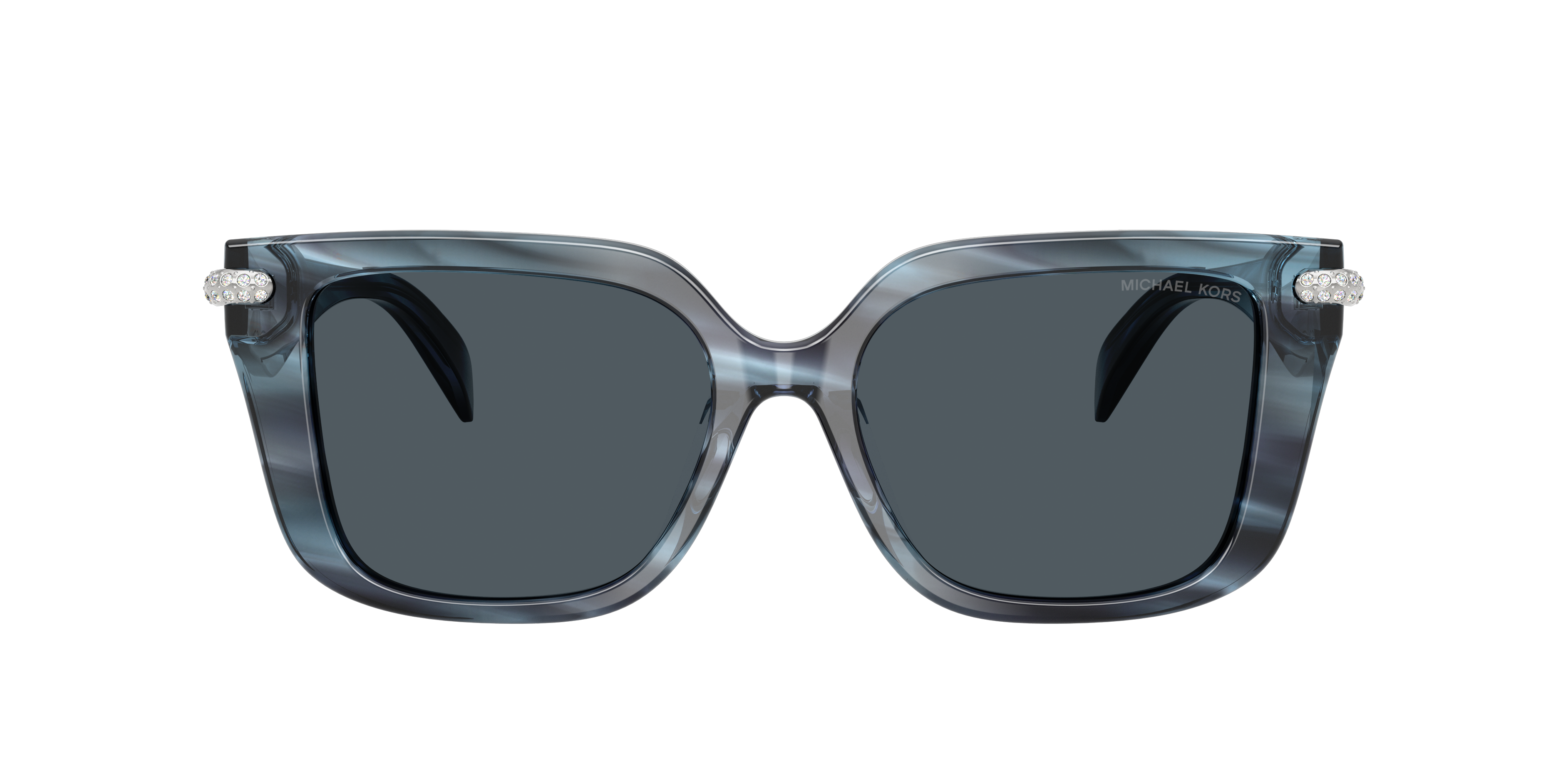 Elevate your eyewear with the Michael Kors MK2275BU Santo Domingo sunglasses. The oversized square sunglasses feature bold lines and sharp angles, crafted from durable plastic for a structured, modern look. Sparkling strass crystal embellishments add a touch of glamour, complemented by vibrant blue lenses and matching acetate temples. Perfectly balanced with a universal fit bridge, these sunglasses exude sophistication and make a striking statement.