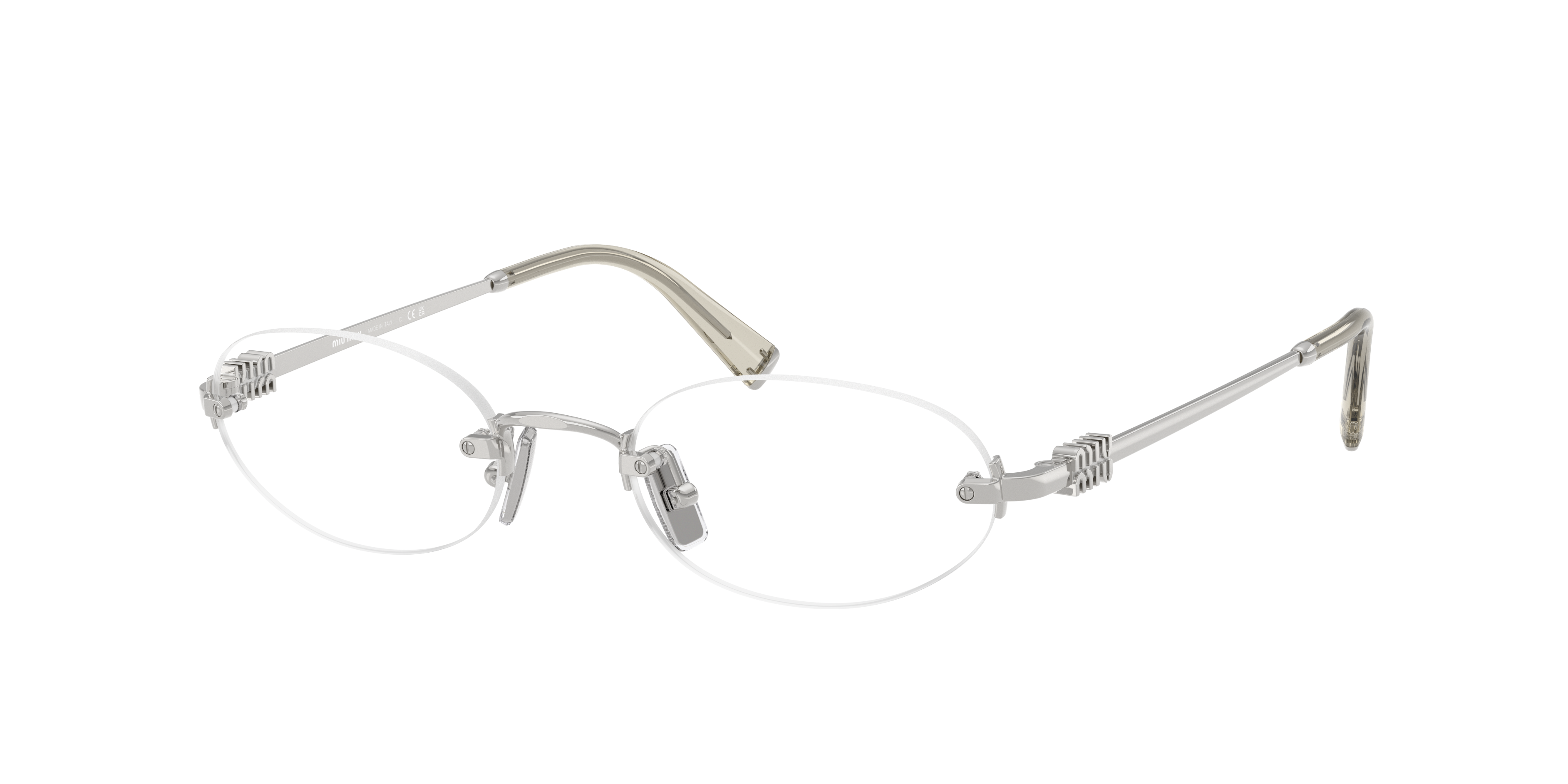 Elevate your style with Miu Miu MU 53WV eyeglasses. These frames are crafted from durable metal, featuring an oval shape that adds a touch of sophistication to any look. The polished silver frame color finish exudes elegance, while the solid color lenses provide a sleek and modern aesthetic. Embrace both fashion and functionality with these stunning shades. Available with prescription lenses.