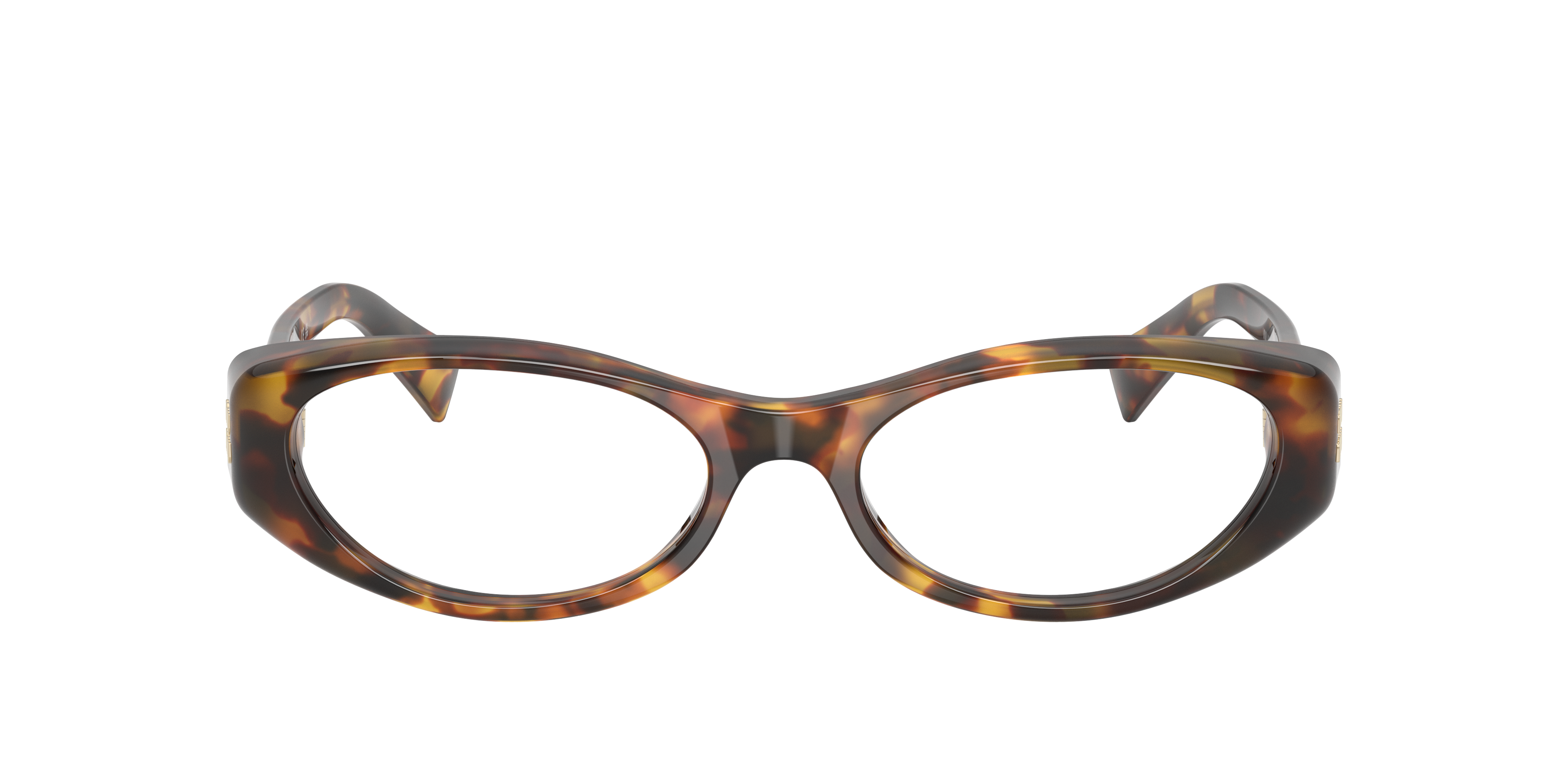 Miu Miu blends timeless elegance with daring design in the MU 03ZV optical glasses. The oval eyeglasses feature full-rim frames with soft, rounded contours crafted from polished plastic in a tortoise hue. A unique layered acetate spoiler enhances the bold silhouette, while the metal vertical logo adds a signature touch. Clear lenses and a standard bridge complete this statement-making style.