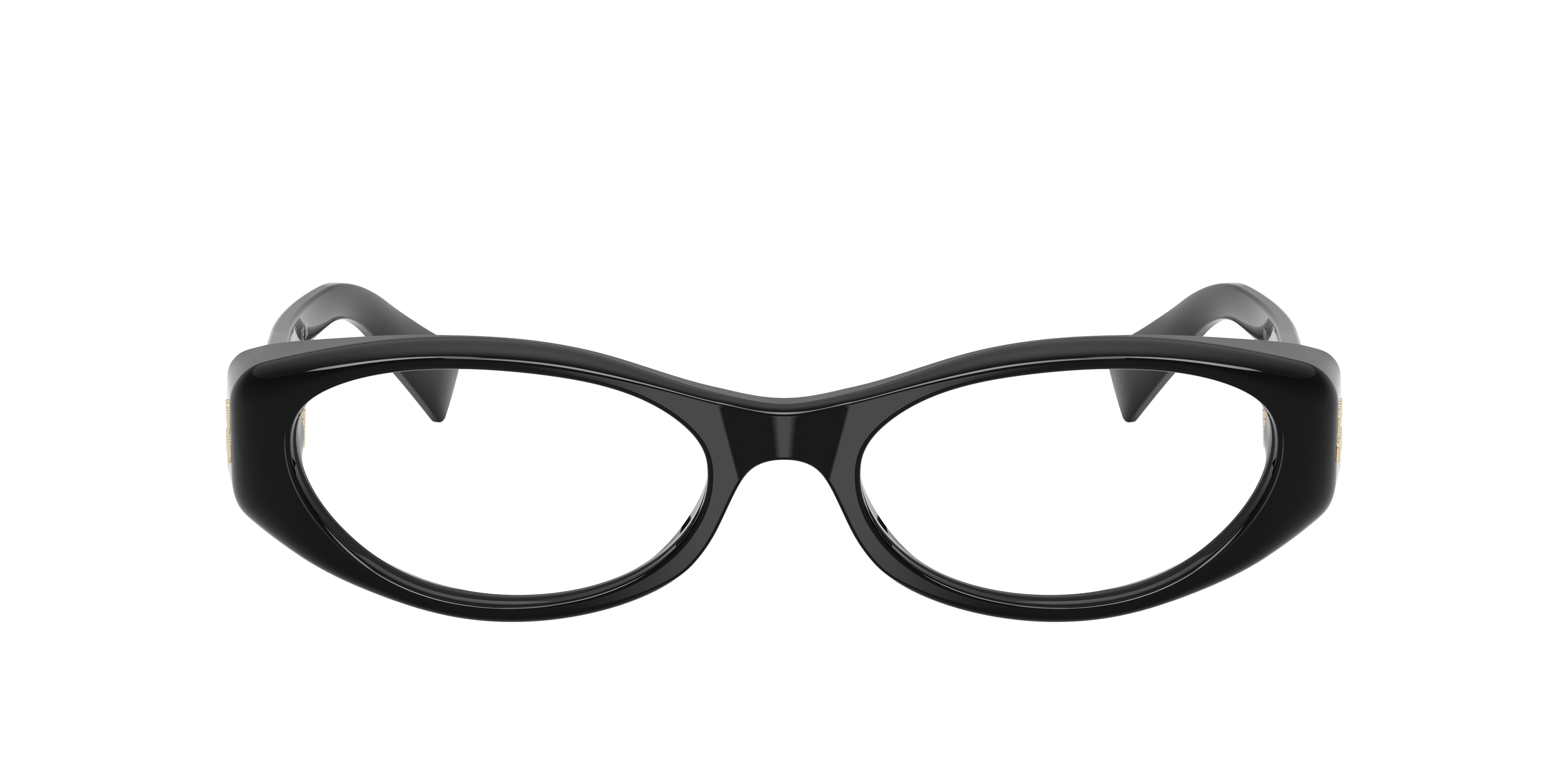 Miu Miu MU 03ZV optical glasses showcase bold elegance with soft, rounded oval eyeglasses crafted from sleek black plastic. A layered acetate technique creates a unique spoiler design, while the temples feature premium acetate for durability. Accented with Miu Miu's signature vertical metal logo, these black glasses bring distinctive sophistication to your everyday style.