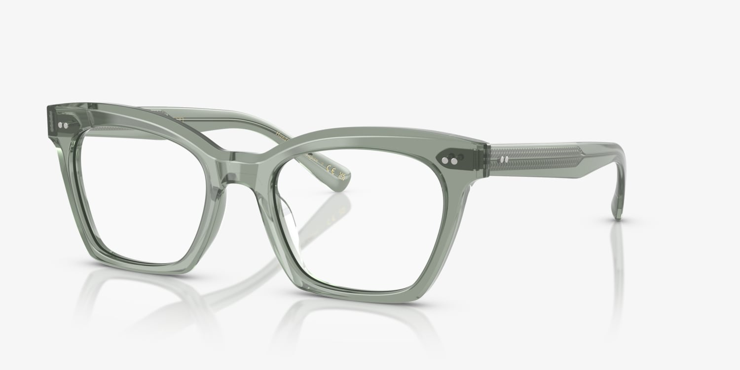 Enhance your style with the unique butterfly shape and polished finish of the Oliver Peoples Lelia eyeglasses in dusty aqua. Made from durable and comfortable acetate, these frames are a fashion statement that also helps improve vision. Embrace your individuality with these exquisite glasses. Available with prescription lenses.