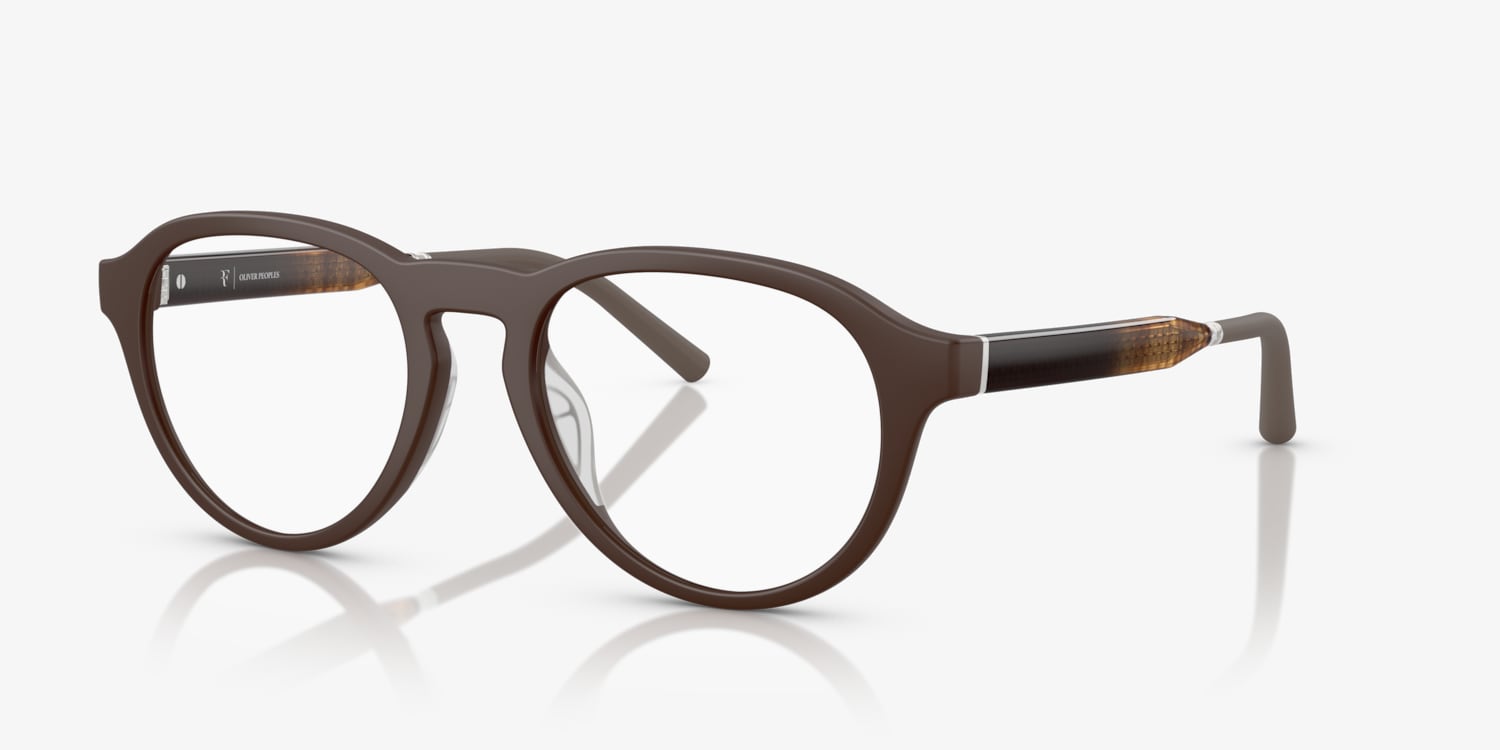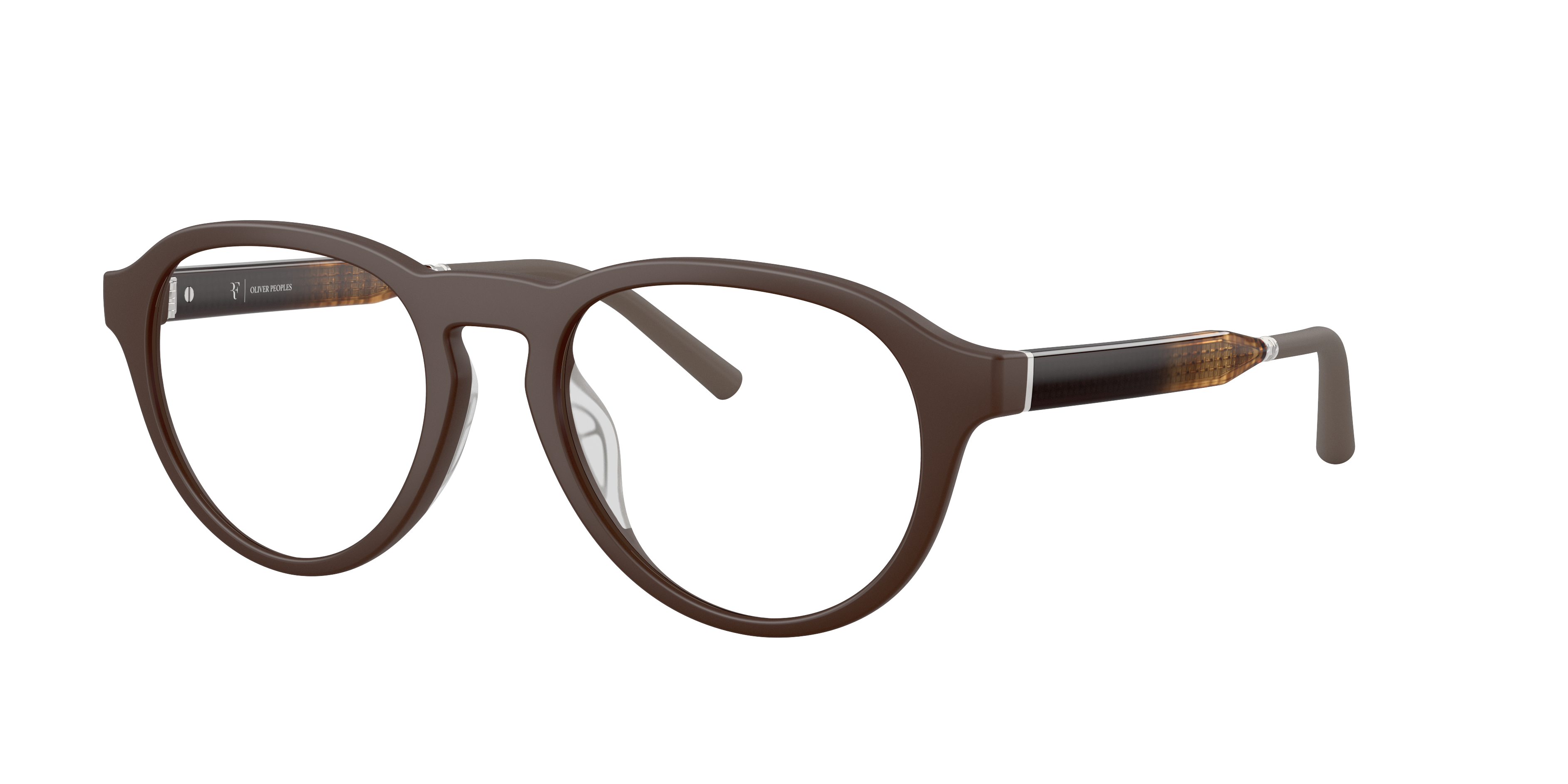 Oliver Peoples R-8R eyeglasses are a unique collaboration between Oliver Peoples and tennis champion Roger Federer. These semi-matte umber frames features a keyhole bridge, offering a modern twist on the iconic phantos shape. The lenses are available in a black frame color, providing a sleek look that is sure to turn heads. These shades can be customized with your choice of lenses, ensuring you get the most out of these stylish specs. Available with prescription lenses.