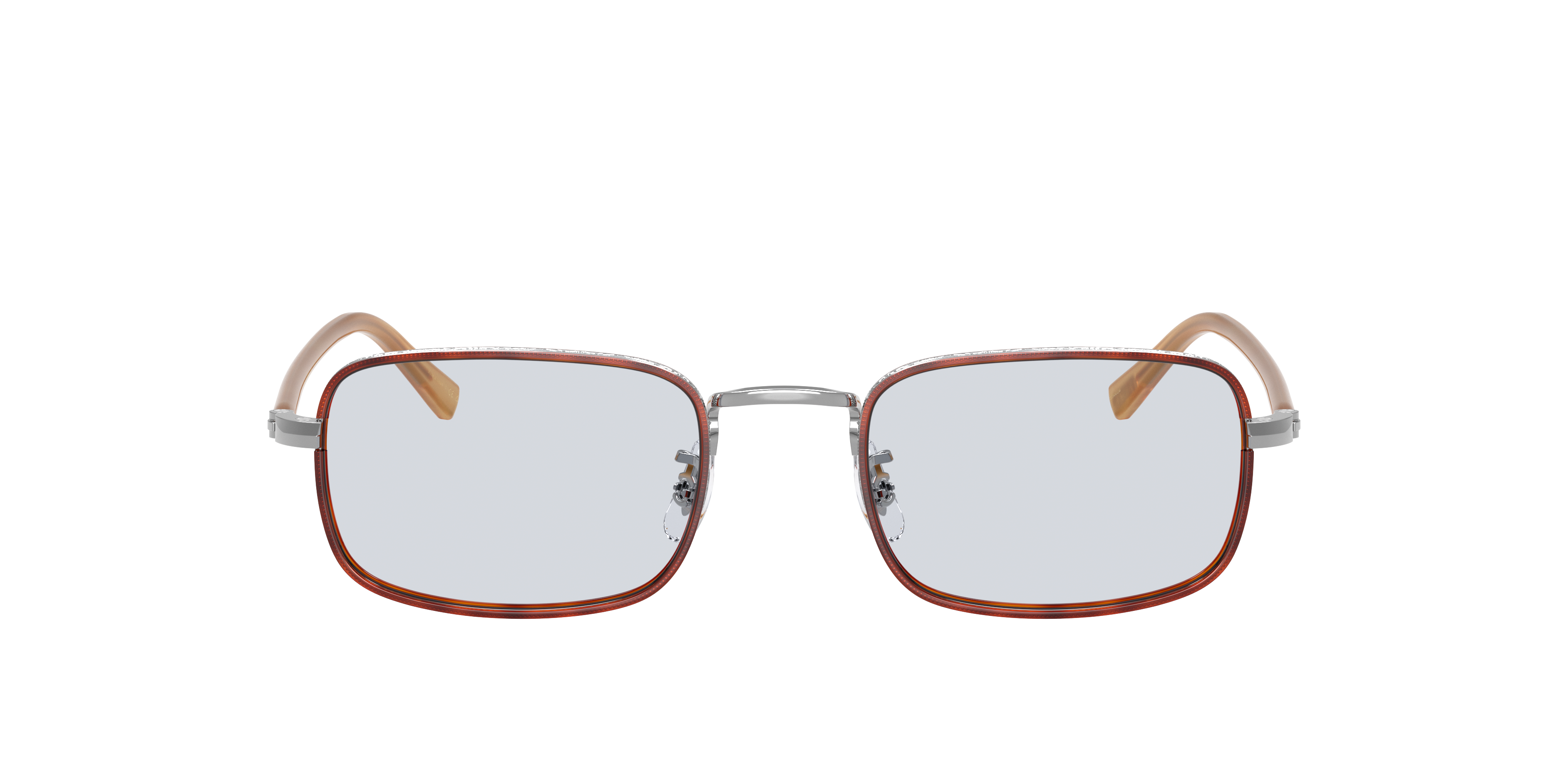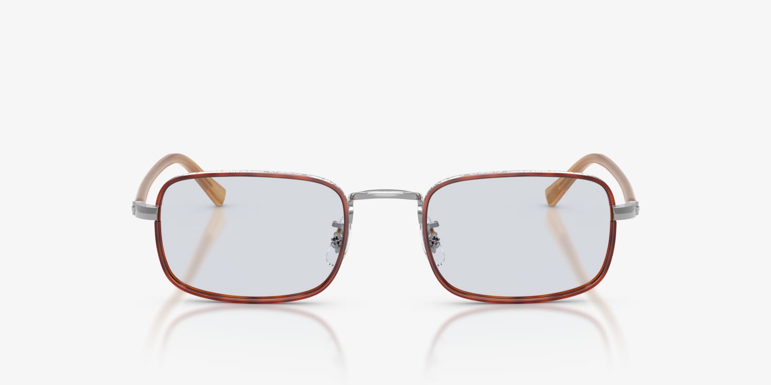Elevate your style quotient with Oliver Peoples Brymer optical glasses. The rectangle shape, crafted from titanium, offers durability and lightweight comfort. The polished silver/amber tortoise frame adds a touch of sophistication to your look. These frames feature a solid color treatment in blue wash on the lenses, offering a unique and stylish design. Embrace the future of fashion with these distinctive optical glasses.
