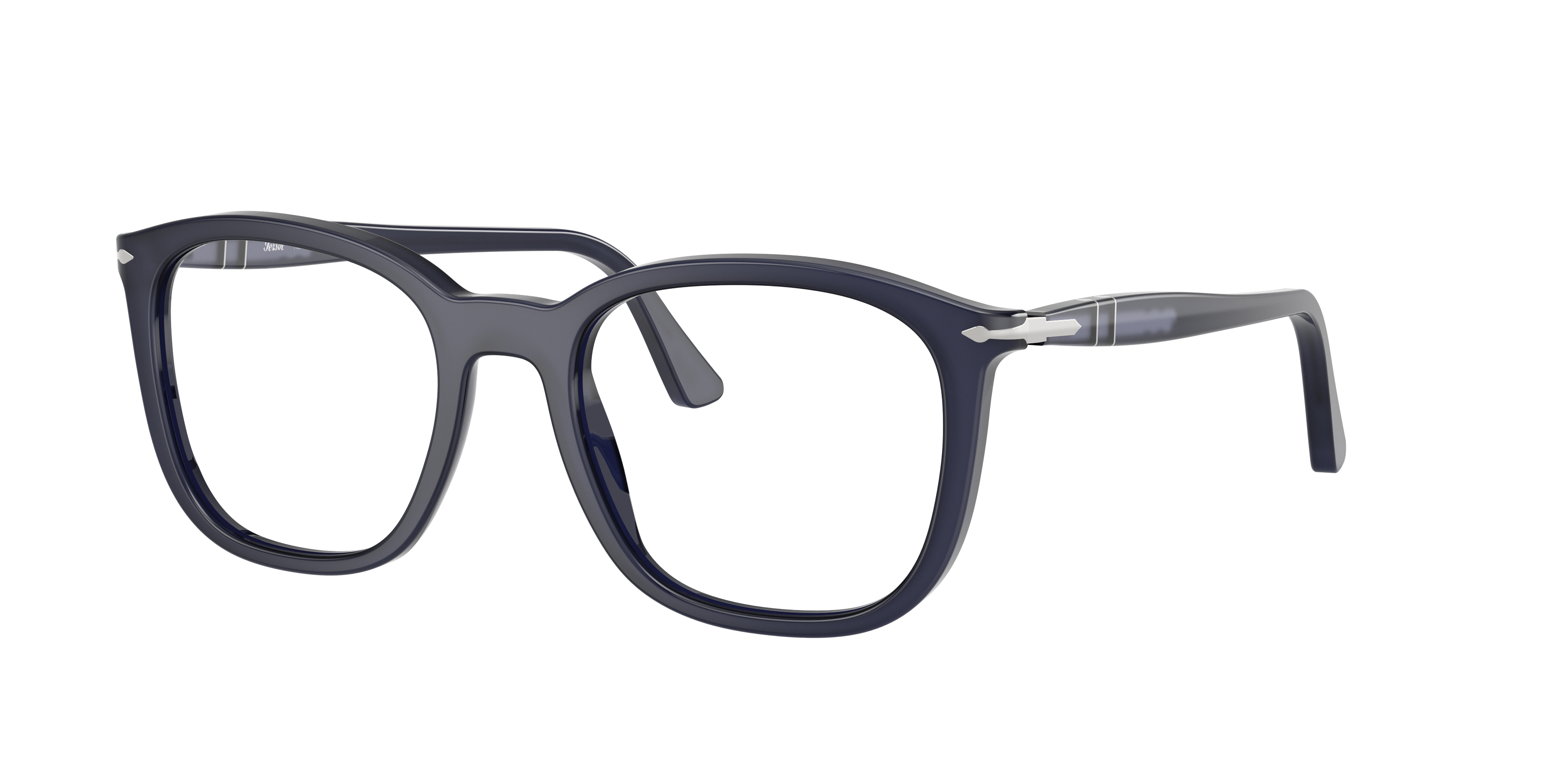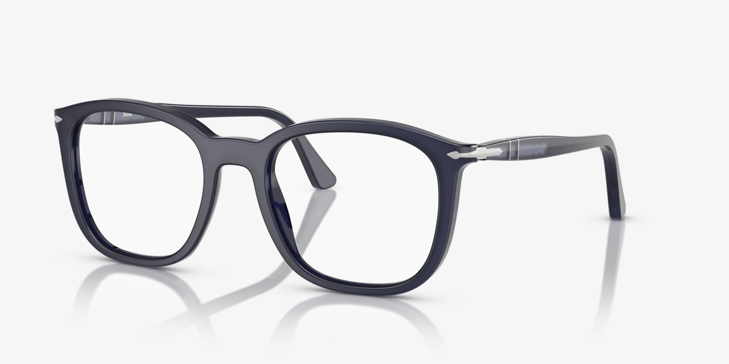 Persol PO3355V eyeglasses seamlessly blend vintage and contemporary style. The pillow shape, combined with the polished acetate frame in a unique milky depths blue color, creates a striking contrast. The saddle bridge adds comfort and stability, making these shades a practical choice for everyday wear. These frames are versatile and stylish, suitable for all fashion-forward individuals. Available with prescription lenses.