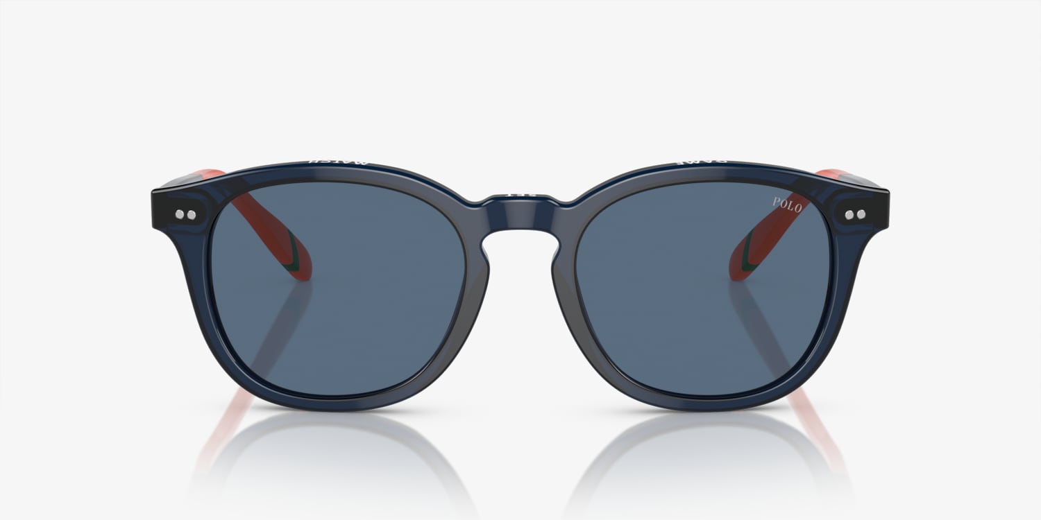 Experience the perfect blend of style and optics with Polo Ralph Lauren PH4206. The polished shiny transparent navy blue acetate frame, paired with solid dark blue lenses, creates a sophisticated look that is sure to turn heads. With its unique phantos shape and keyhole bridge, these shades offers a modern twist on a timeless style. Embrace the effortless elegance of Polo Ralph Lauren. Available with prescription lenses.