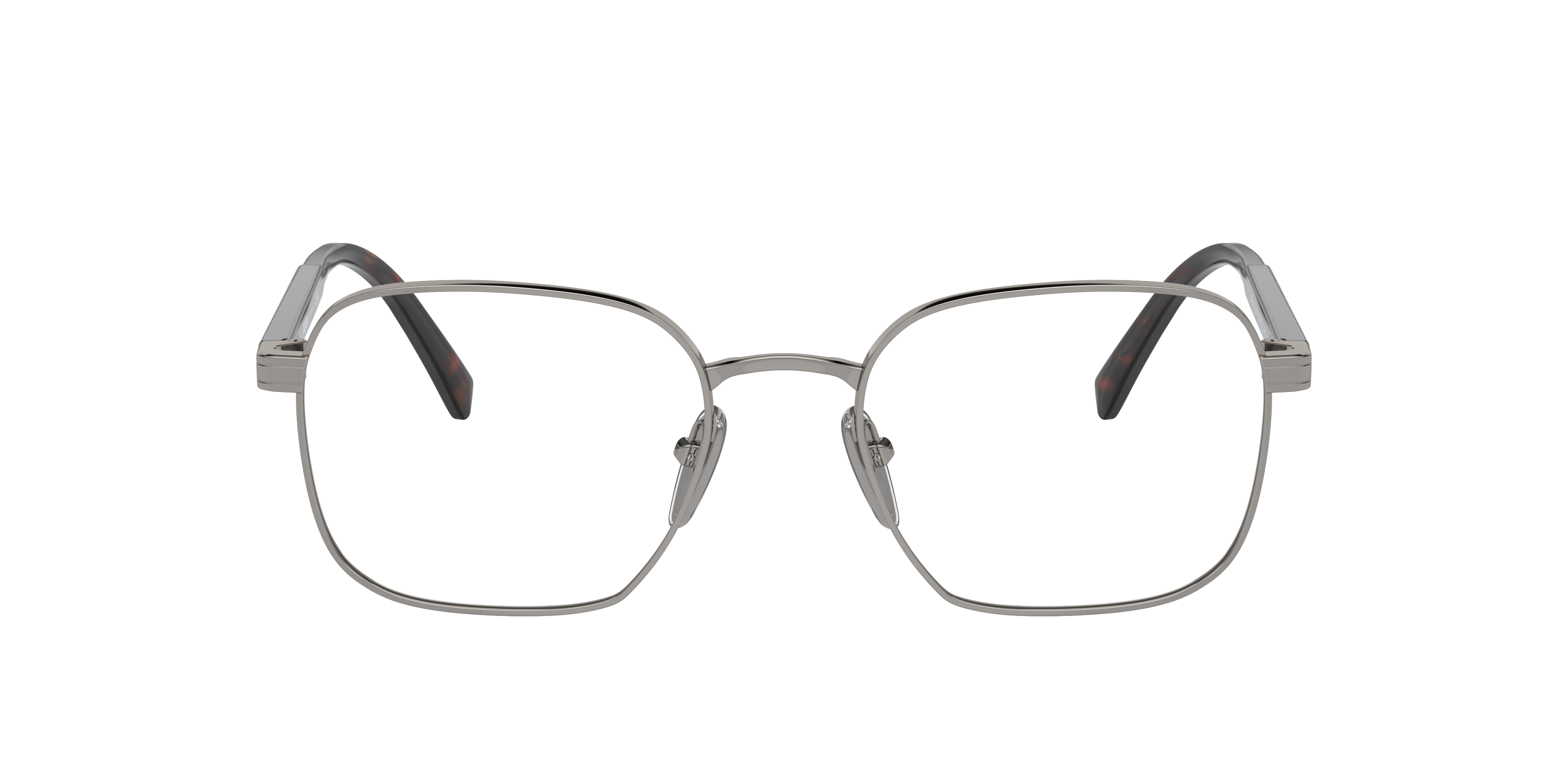 The Prada PR A55V optical glasses embody elegance and refinement. Featuring a sleek rectangular metal front that combines lightweight comfort with a polished look, they are paired harmoniously with acetate temples adorned with a striking logo plaque. Finished with a silver, gunmetal, and grey colorway, adjustable nosepads eyeglasses enhance the fit for all-day ease.