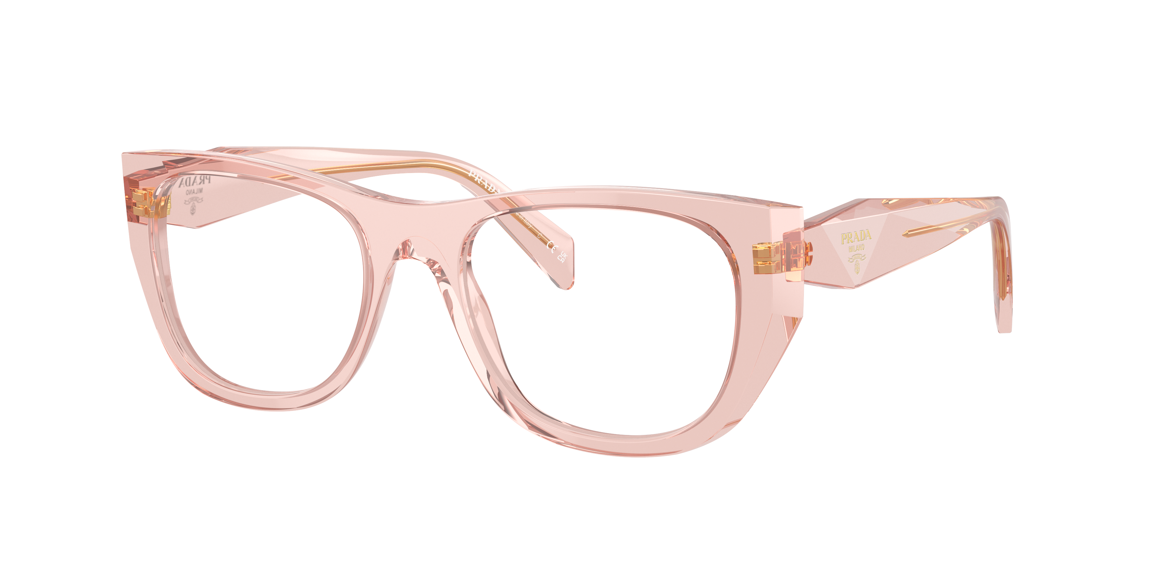 Elevate your fashion game with Prada PR A18V eyeglasses. The irregular shape and polished finish of the transparent peach acetate frame add a unique touch to your look. These frames are not only stylish but also versatile, making them a must-have accessory for any fashion-forward individual. Embrace your individuality and make a statement with these stunning Prada glasses. Available with prescription lenses.