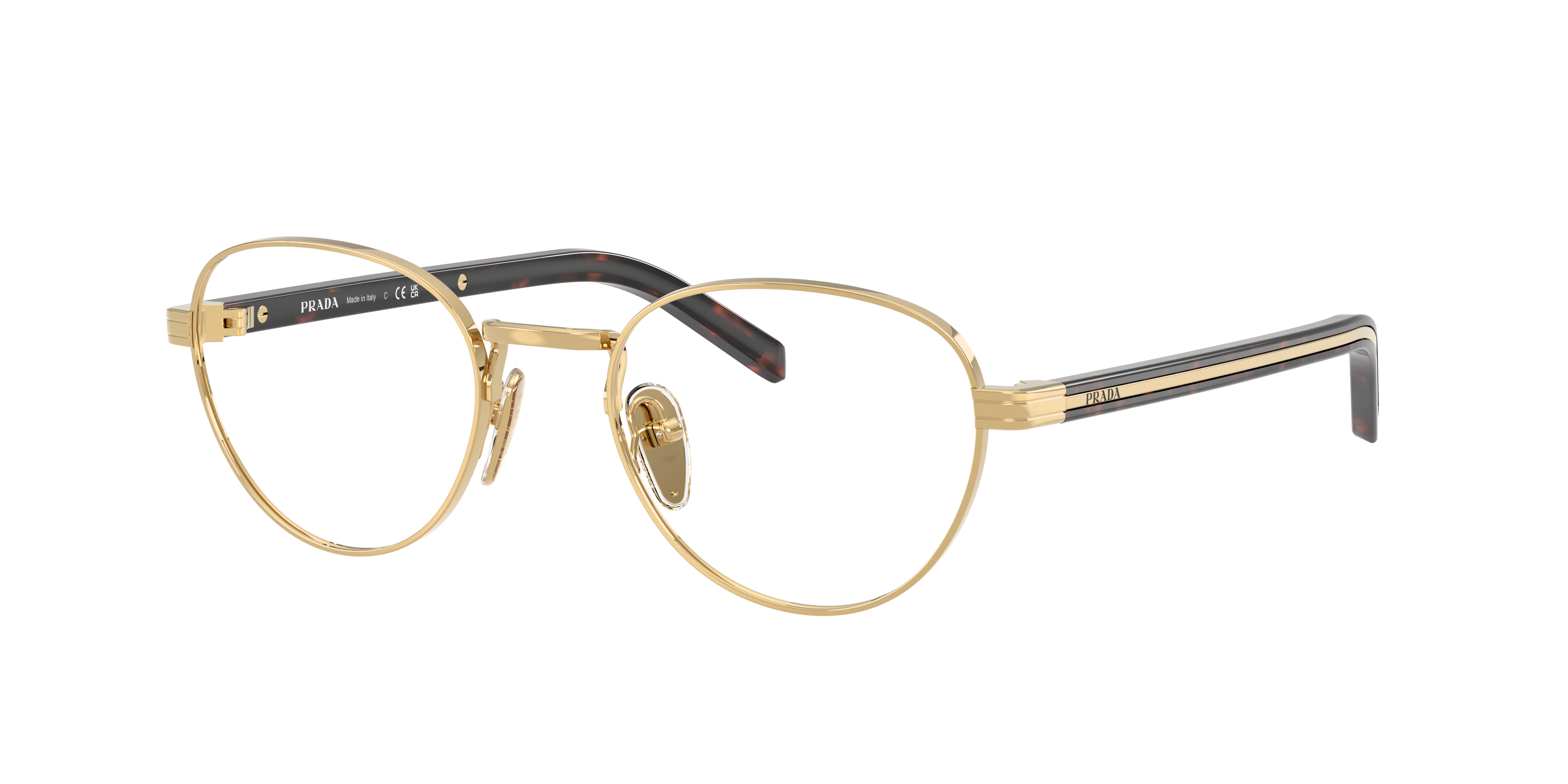 Experience the interplay of exquisite craftsmanship and visionary design in Prada PR B53V eyeglasses. These round-shaped frames are made from durable steel, ensuring longevity and comfort. The polished gold finish adds a touch of elegance to any outfit, making these glasses a great choice for everyday wear. The frame color also comes in a polished black finish, offering versatility to suit your preferences. Available with prescription lenses.