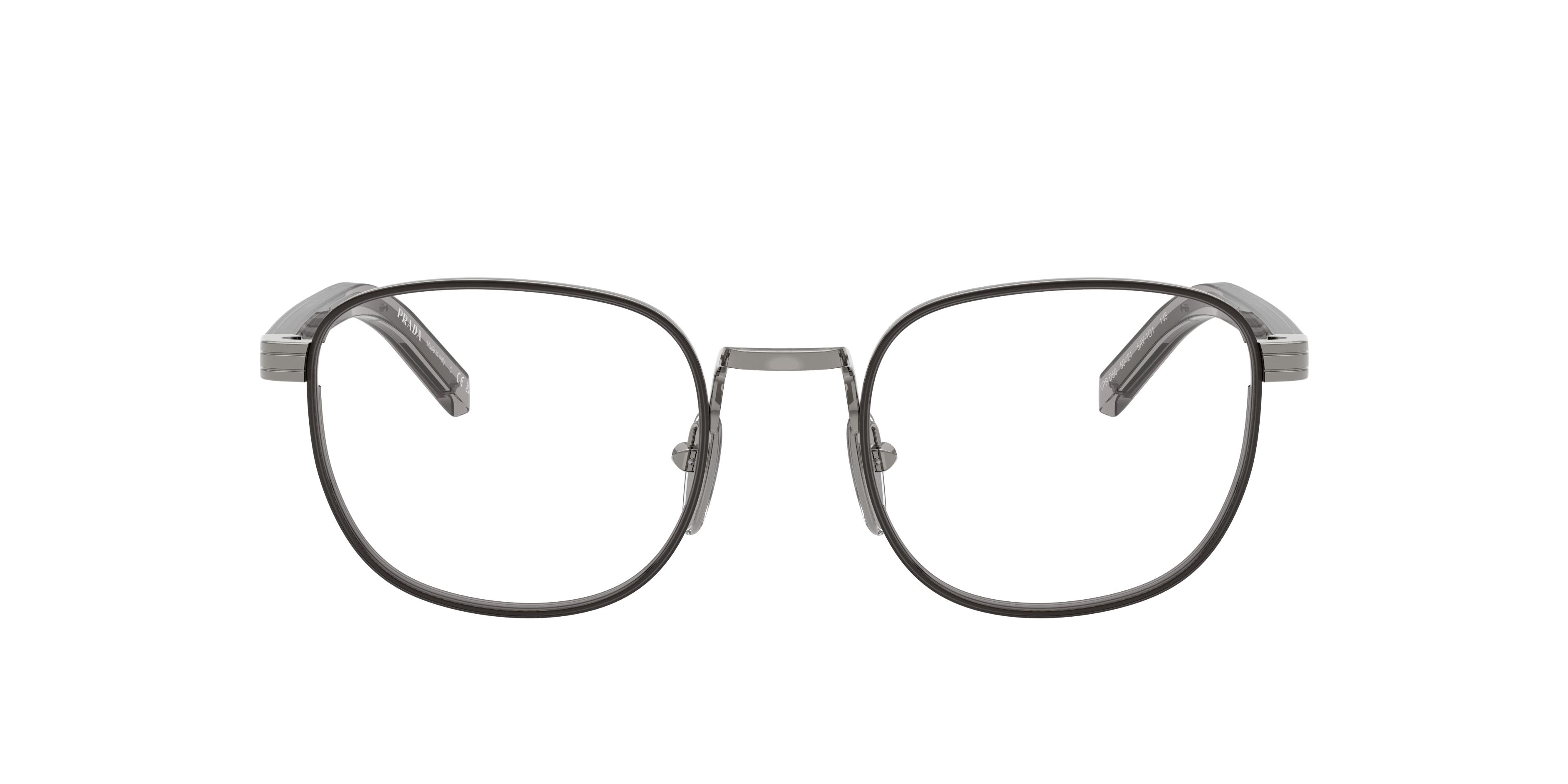 Refined craftsmanship and elegant restraint define the Prada PR D50V optical frames. The timeless panthos shape features lightweight metal construction, paired with acetate rims for a sophisticated contrast. Adjustable nosepads enhance comfort, while silver tones and a sleek hinge mechanism provide polished details. Finished with Prada's iconic laser-etched lettering in black enamel, these Prada frames for men embody understated luxury.