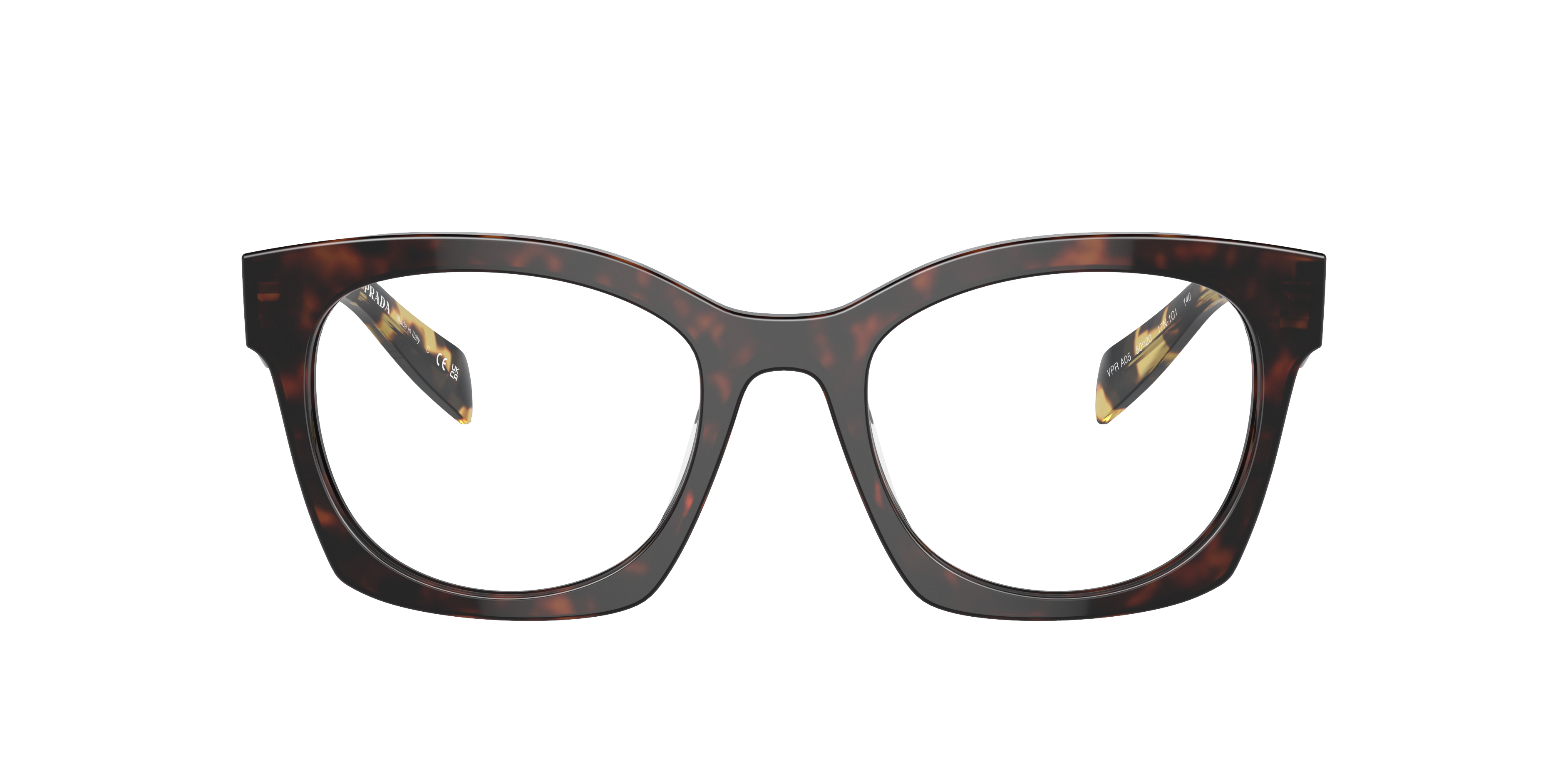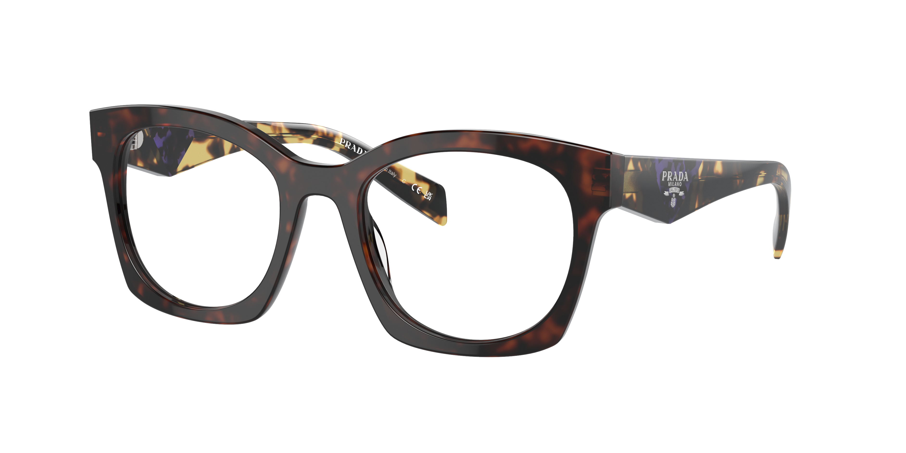 Elevate your fashion with Prada PR A05V eyeglasses. The irregular shape and polished havana acetate frame offers a unique and stylish look, while the black color gives it a timeless appeal. These frames are designed to showcase your individuality, making them a perfect choice for everyday wear or special occasions. Available with prescription lenses.