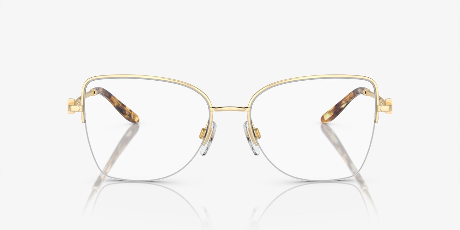 Elevate your style quotient with Ralph Lauren RL5122 optical frames. The butterfly shape, crafted from polished metal in a pale gold color, exudes elegance and sophistication. These glasses features a unique design that is sure to turn heads and make a statement. The frame comes in a polished finish, adding to its luxurious appeal. Whether you're looking for fashion or functionality, these glasses are the perfect choice for you. Available with prescription lenses.