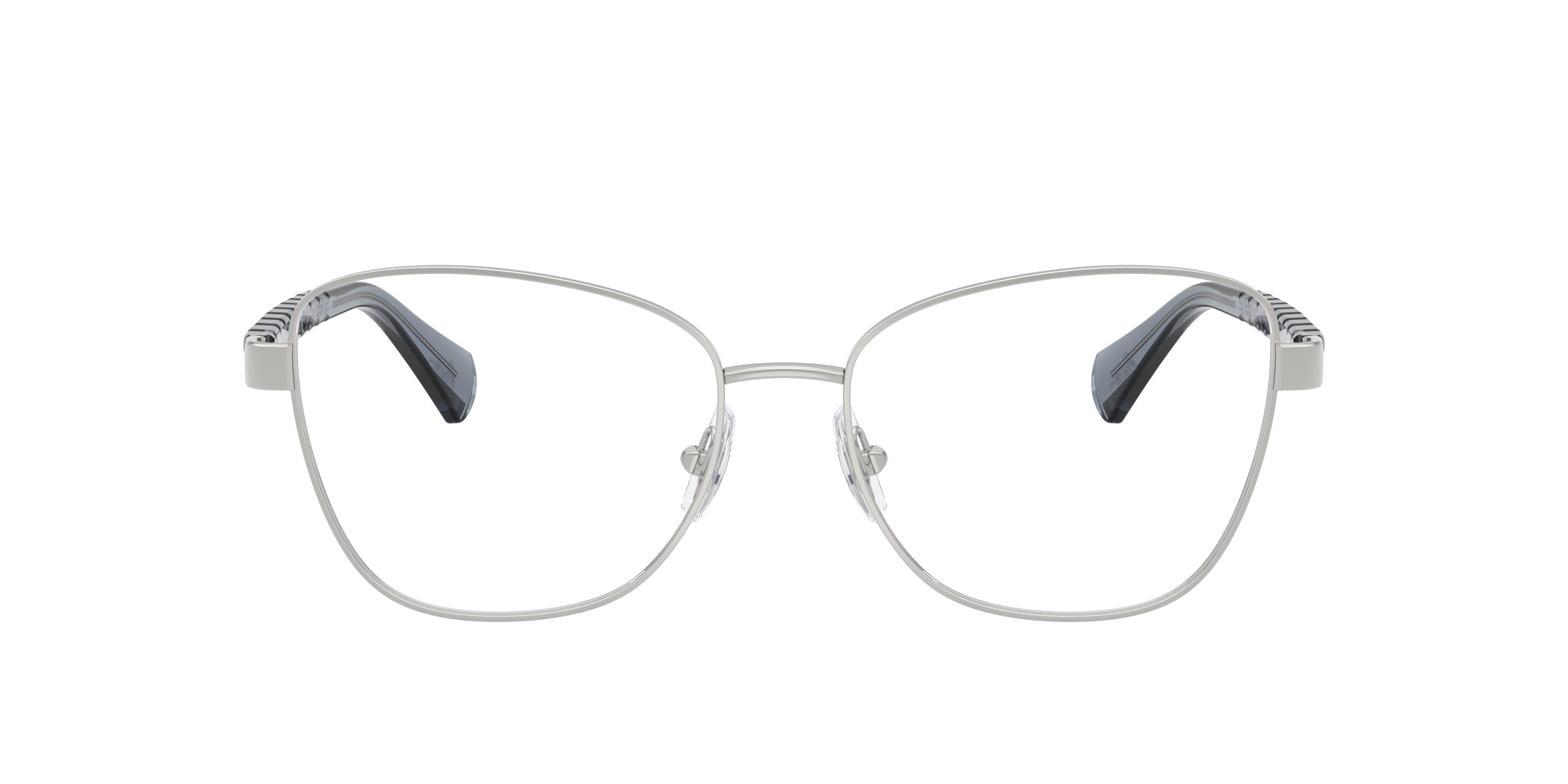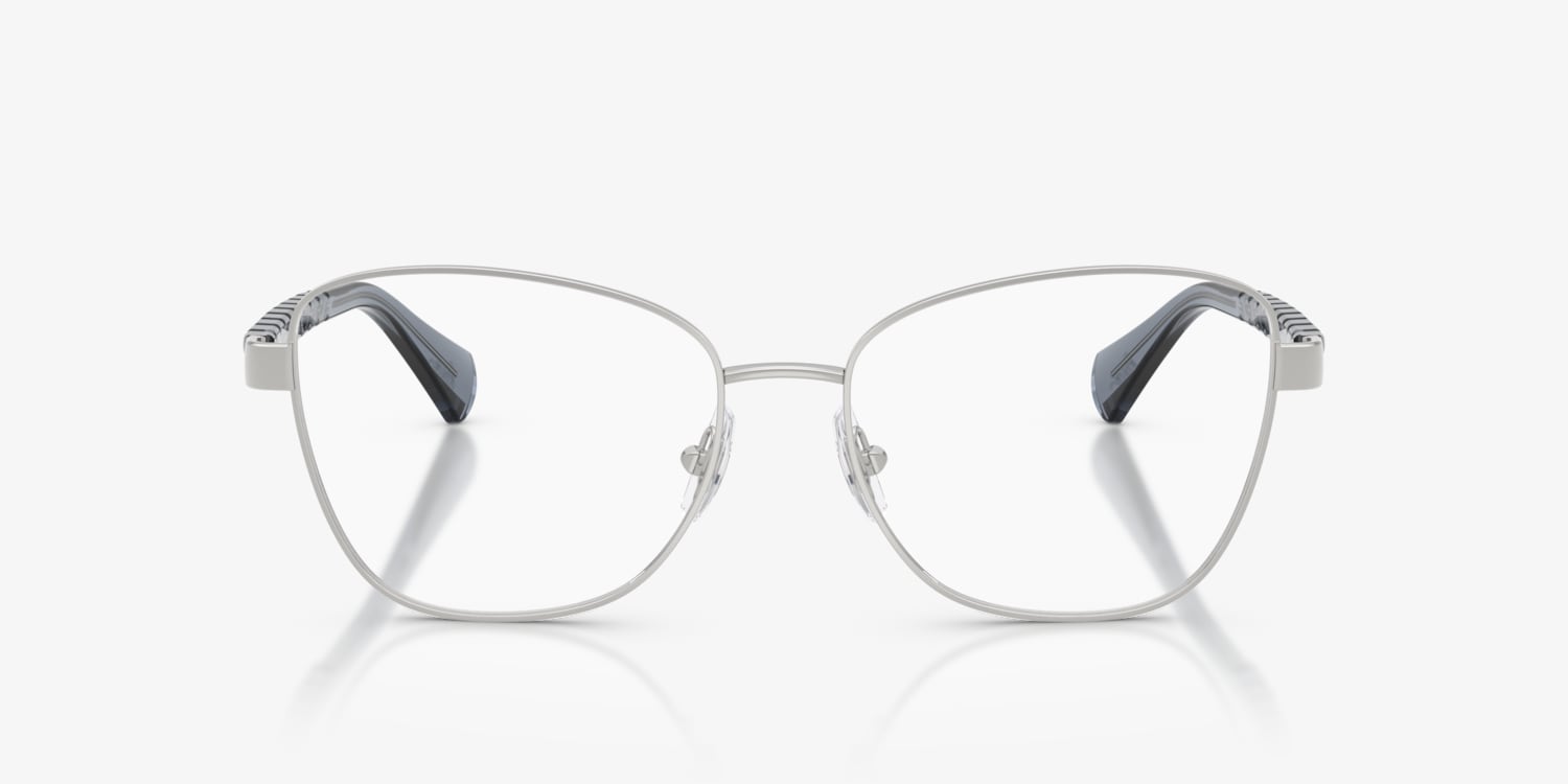 Elevate your everyday style with the Ralph RA6064 optical glasses. The oversized metal frames feature a softly irregular design that makes a bold statement. Inspired by cable knits and chain motifs, the injected temples add distinctive flair. Finished with a silver, gunmetal, and grey color blend and the Ralph script logo at the tips, these irregular glasses are effortlessly chic and endlessly versatile. Clear lenses and adjustable nosepads glasses ensure comfort and a tailored fit.