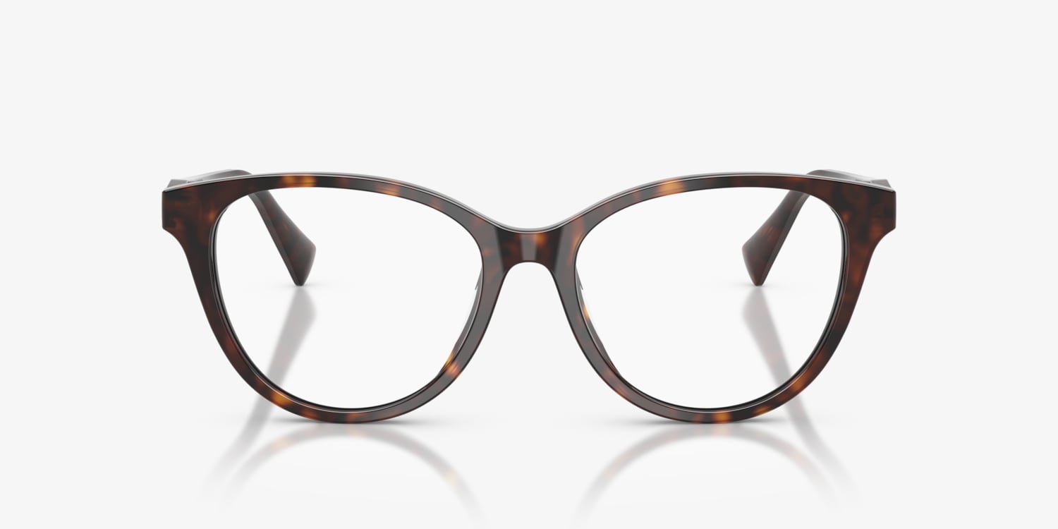 The RA7198U by Ralph blends vintage allure with modern sophistication. These cat eye frames feature a charming butterfly-inspired design in lightweight plastic with tortoise eyeglasses accents. The softly curved, beveled acetate temples showcase the bold Ralph block logo for a touch of elegance. Designed with a standard bridge and frames with a universal fit, they offer timeless style for adults seeking refined eyewear.