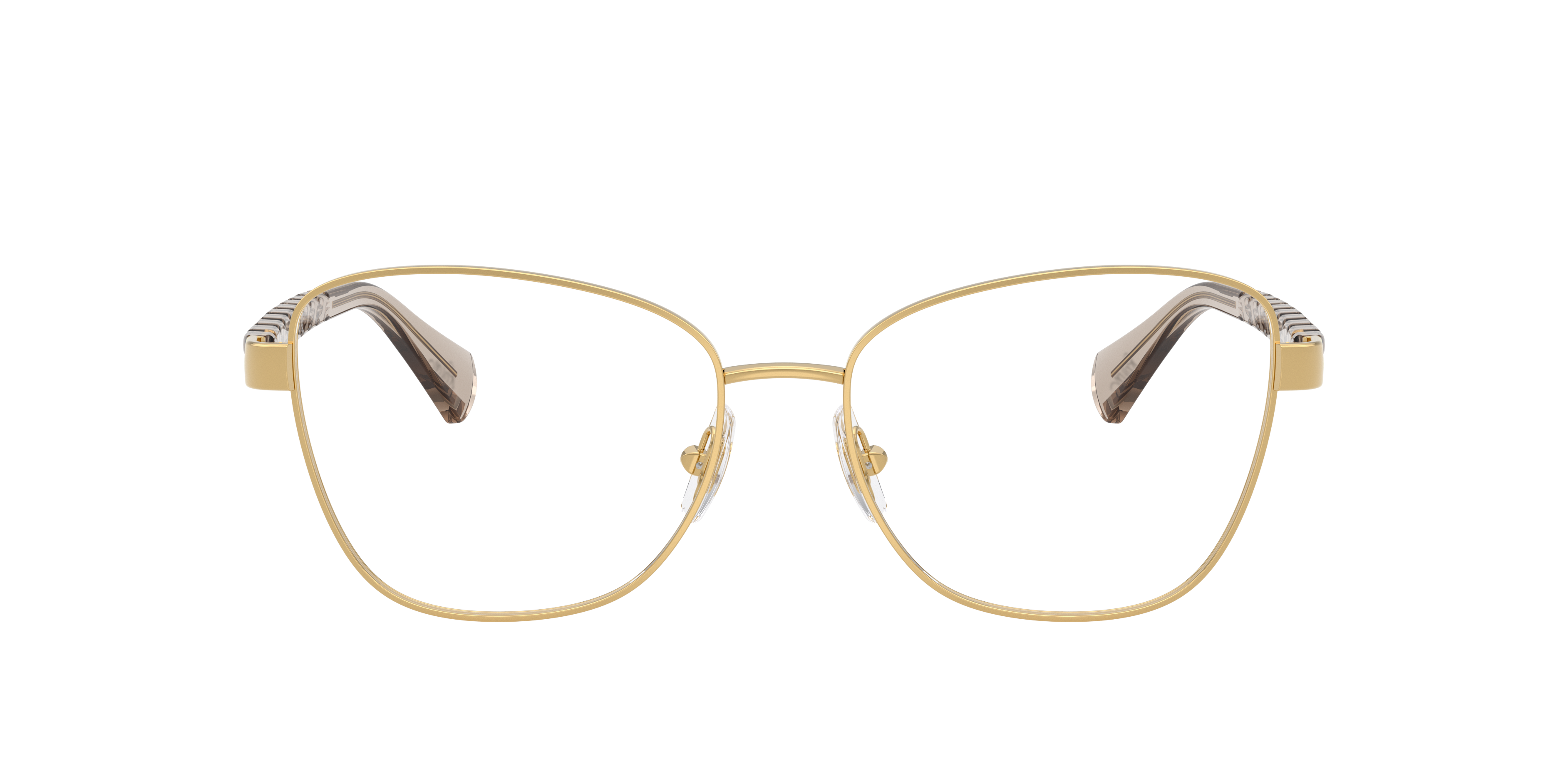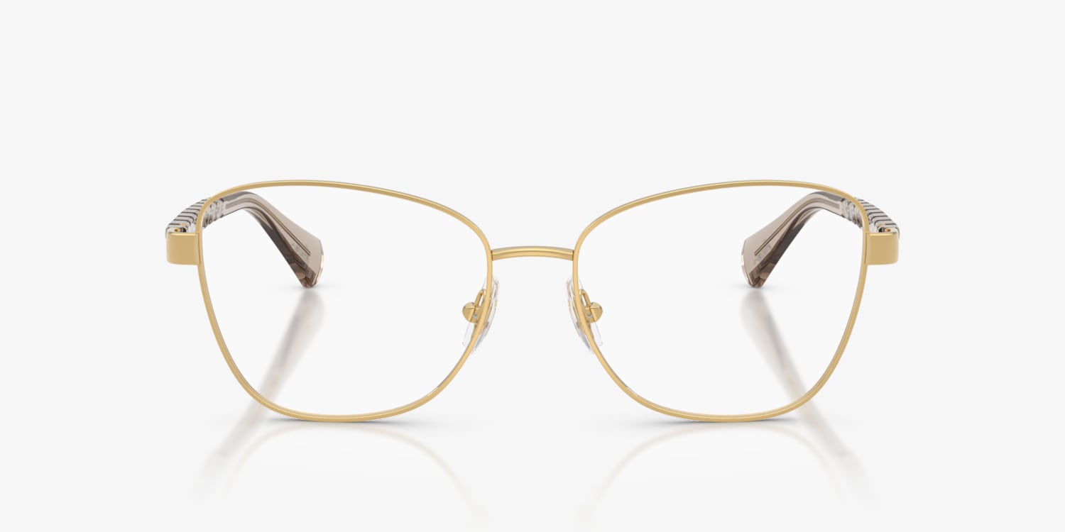 Elevate your everyday style with the Ralph RA6064 optical glasses. The softly irregular eyeglasses feature gold metal frames that exude lightweight elegance, complemented by distinctive injected temples inspired by cable knits and chain motifs. Designed for comfort, these Ralph eyeglasses include adjustable nosepads and a standard bridge. Finished with the Ralph script logo at the tips, these sophisticated glasses are endlessly wearable.