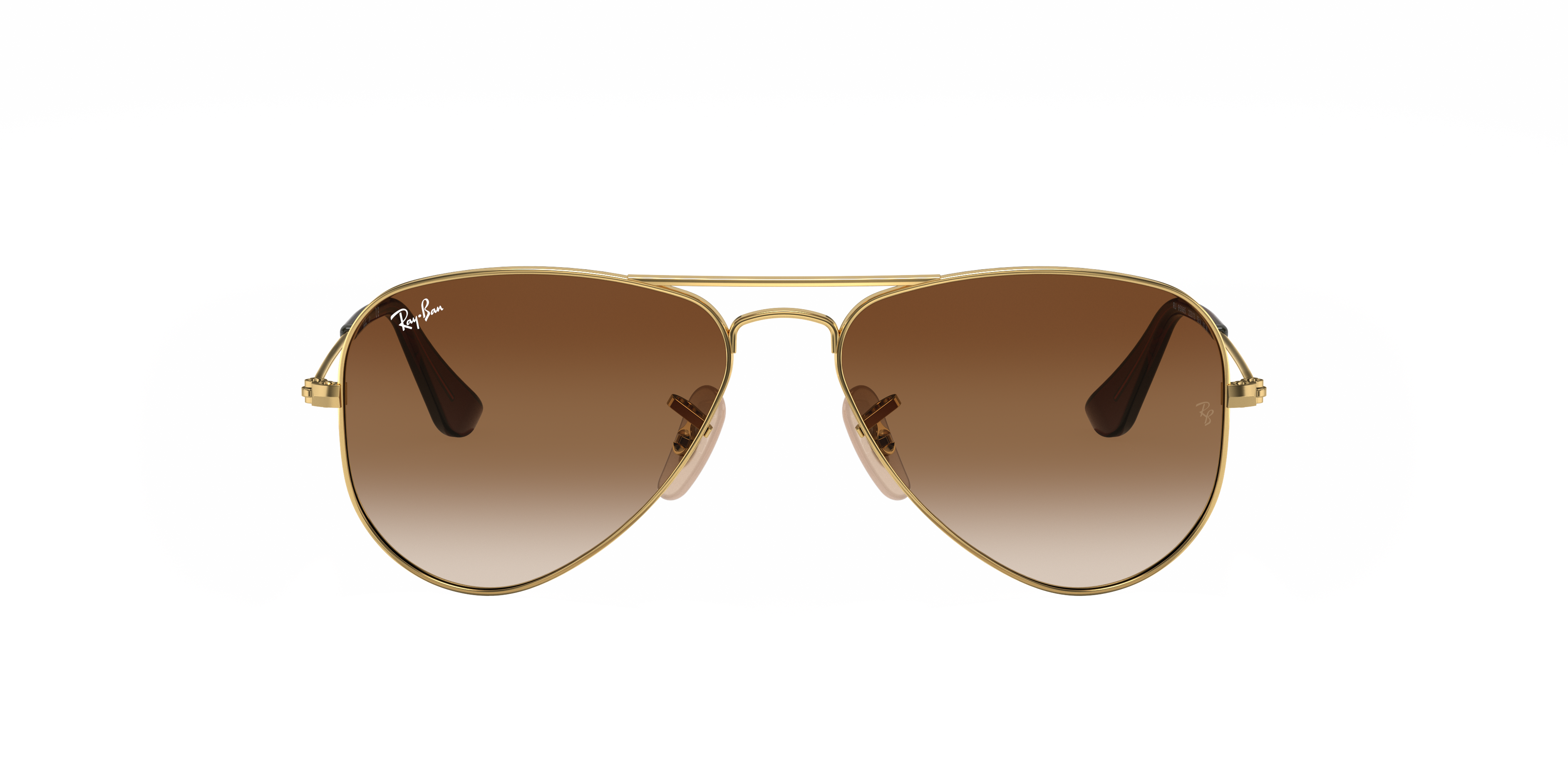 Ray-Ban Aviator Kids sunglasses are a perfect blend of style and comfort for your little one. The pilot shape, crafted from durable metal, is designed to fit comfortably on children's faces. The polished gold frame adds a touch of elegance, while the gradient brown lenses provide optimal protection against the sun's harmful rays. These shades not only protect your child’s eyes but also make them look cool and stylish. Available with prescription lenses.